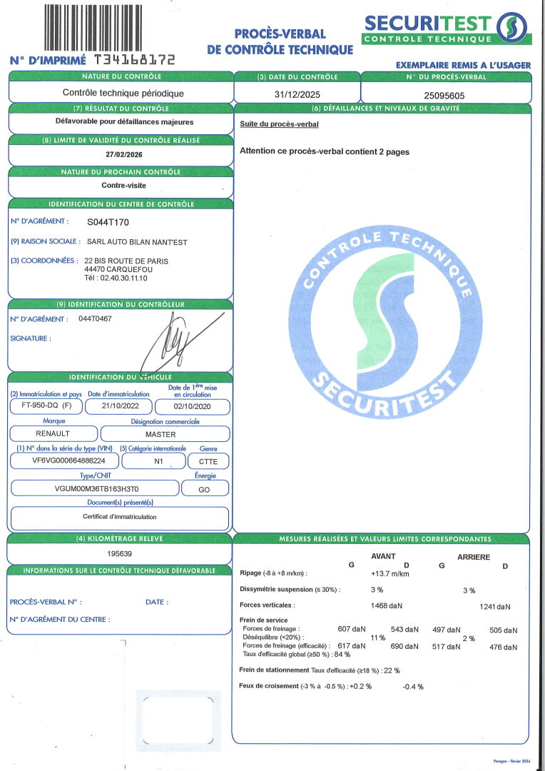 EXPOSITION DU VEHICULE LE 22/01/2026 DE 8H00 A 9 H00 AU 17 RUE DE L'OUCHE BURON A NANTES- ENLEVEMENT SUR RDV. moteur à changer suite entretien BVM6- CLIM- RADIO- VITRES ET RETROS ELECT- REGULATEUR DE VITESSES. EMPATTEMENT: 4400 ENVIRON. PORTE A FAUX AR: 1600 ENVIRON. CAISSE: 4200 X 2100. SIEGES EN TISSU TACHES- SIEGE CONDUCTEUR DECHIRE- PLASTIQUES RAYES ET TACHES. RETRO D ET G CASSES- PARE BRISE FISSURE- FROTTEMENT DU BAS DE CAISSE AVG ET CAISSE COTE G- MAUVAISE FIXATION DES FEUX DE GABARIT- MANQUE FEUX DE GABARIT ARG ET ARD. DEFAILANCES MAJEURES: VITRE AV FISSUREE- DEFAUT D'ORIENTATION DES FEUX AVG ET AVD- ECLAIRAGE DES FEUX DE GABARITS G ET D DEFECTUEUX-VISIBILITE FORTEMENT REDUITE DU FEU STOP ARG ET DU FEU DE DETRESSE G- DEFAUT D'OPACITE. DEFAILLANCES MINEURES: DISQUES OU TAMBOURS DE FREINS AVG ET AVD LEGEREMENT USES- RIPAGE EXCESSIF- BALAI D'ESSUIE GLACE AVG ET AVD DEFECTUEUX- MAUVAISE FIXATION DES FEUX DE GABARIT G ET D- 4 PNEUS SOUS GONFLES- CARROSSERIE AVG ENDOMMAGEE- DEFAUT D'OPACITE. FRAIS JUDICIAIRES 11.9 % HT