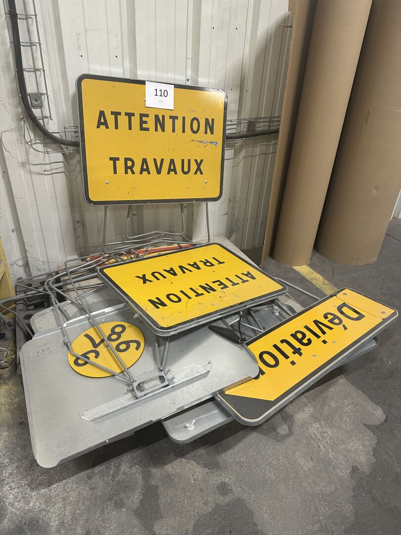6 panneaux de signalisation dont "ROUTE BARREE" "DÉVIATION" "ATTENTION TRAVAUX"