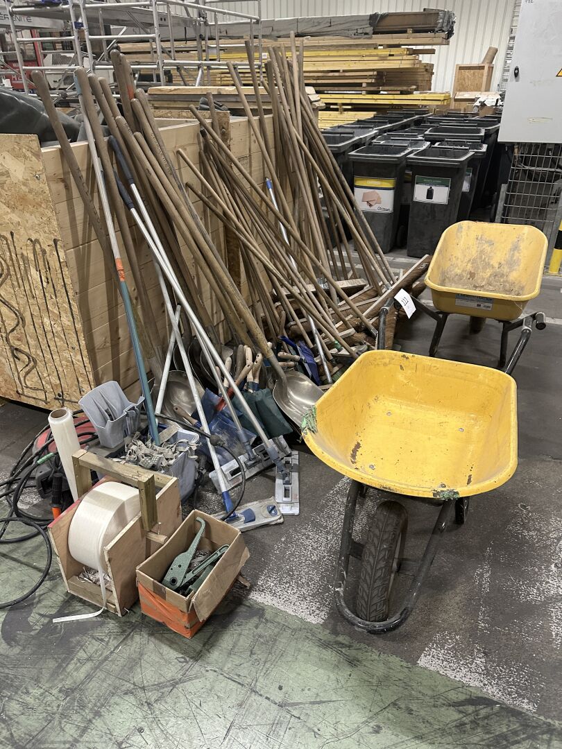 2 brouettes HAEMERLIN, en métal laqué jaune roue gonflée Lot de balais, seaux, pelles, 2 cercleuses manuelles avec feuillard nylon 24 poubelles PVC noires roulantes sans couvercle