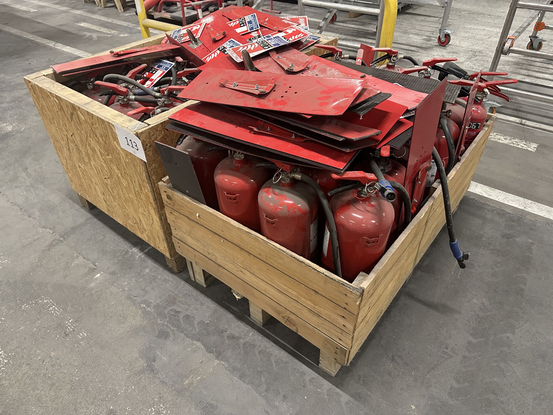 Dans 2 caisses bois : 1 lot d'extincteurs comprenant environ : 2 extincteurs 2 kg dioxyde de carbone 40 extincteurs 9 l eau de 2022 essentiellement, plaques indicatives
