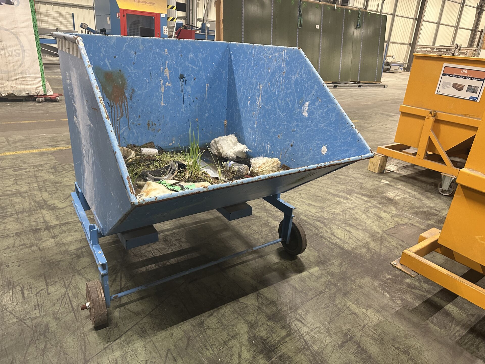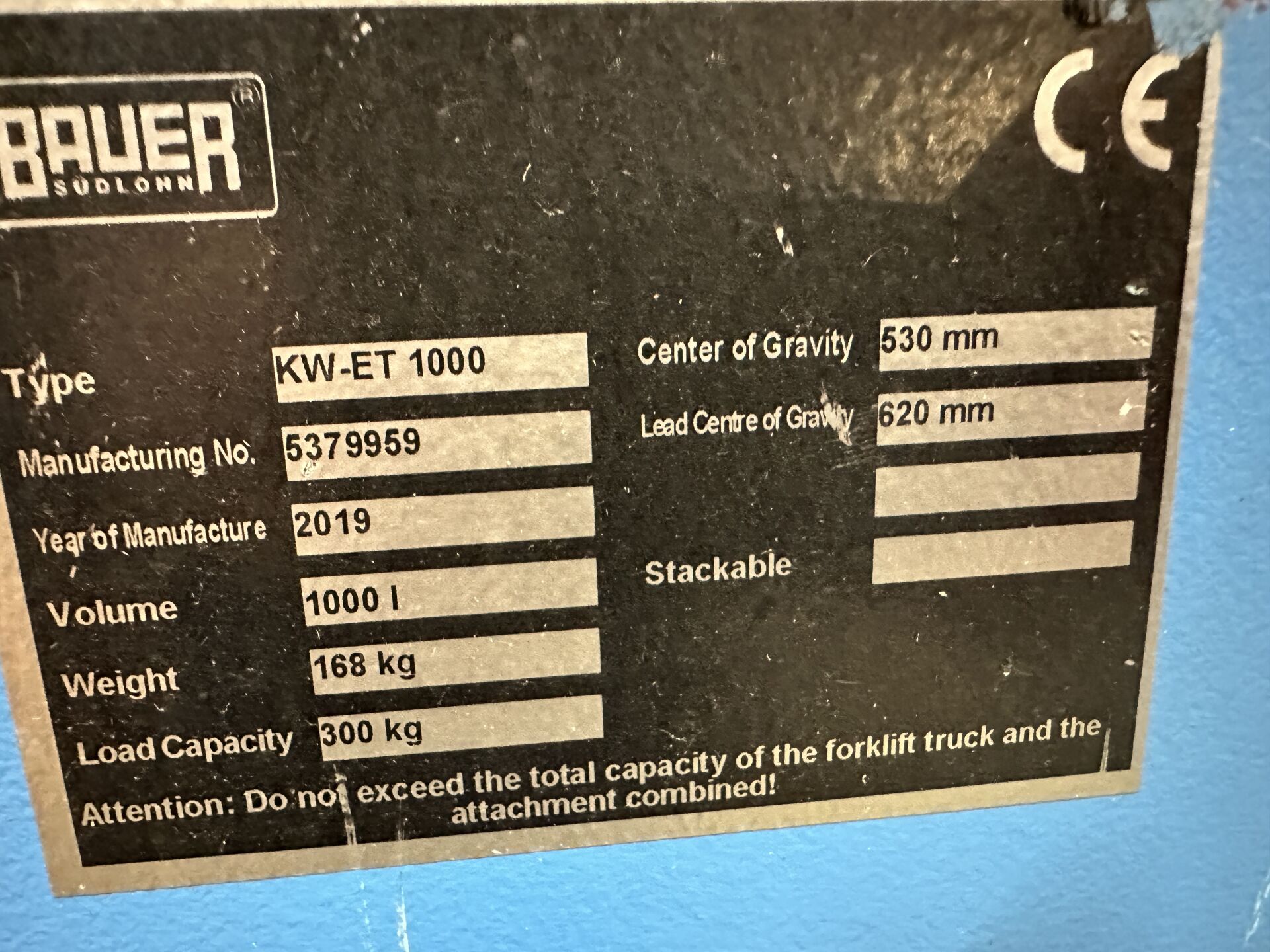1 benne autobasculante BAUER type KW ET 1000, 1000 litres, PAV 168 kg, charge utile 300 kg, de 2019, prises fourches