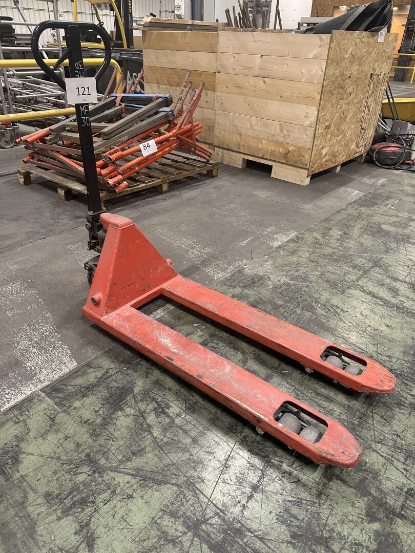 1 transpalette manuel en métal laqué rouge, sans marque apparente, capacité 2.5 T