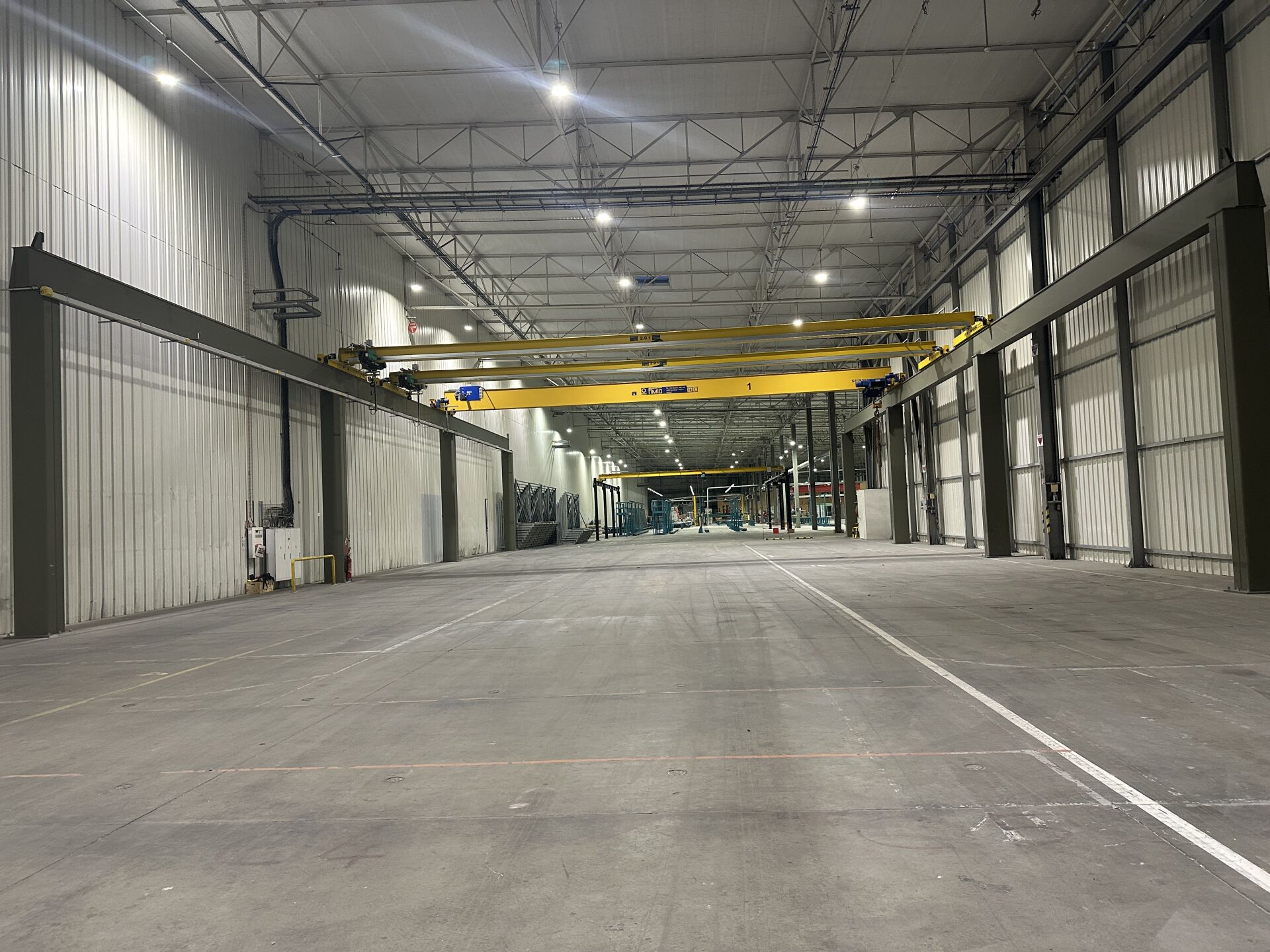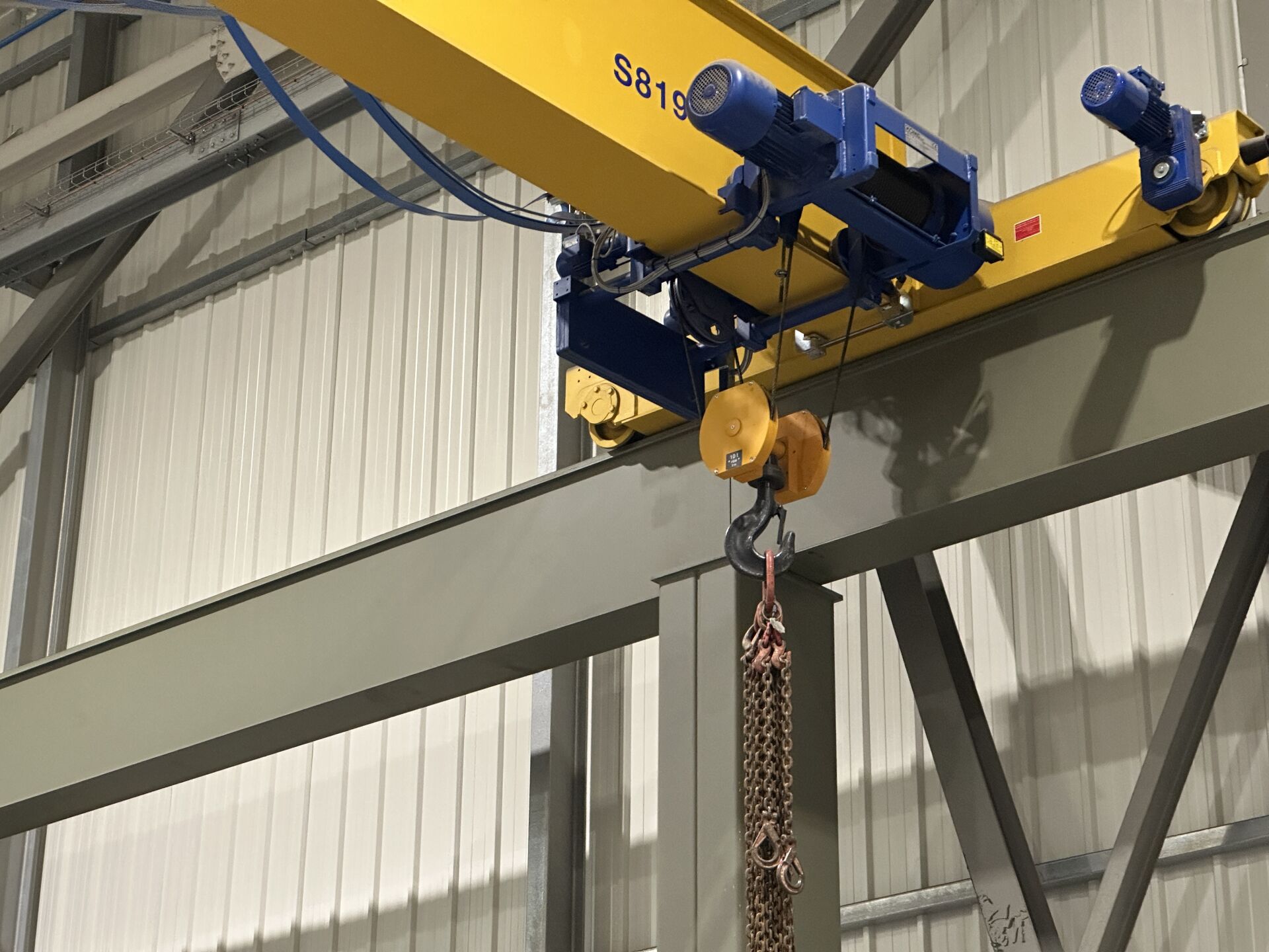 1 pont roulant AMIO, modèle OMIS 10 T, capacité 10 T, portée 19.5 m, avec 1 radiocommande et 1 chemin de roulement de 36 m indépendant de la structure du batiment comprenant 8 poteaux (80 x 50 cm) hauteur environ 6 m NS : S 8193010