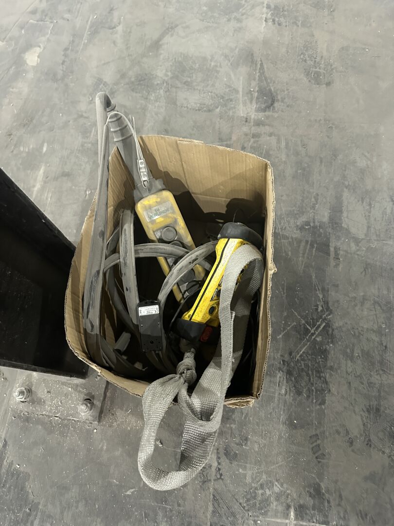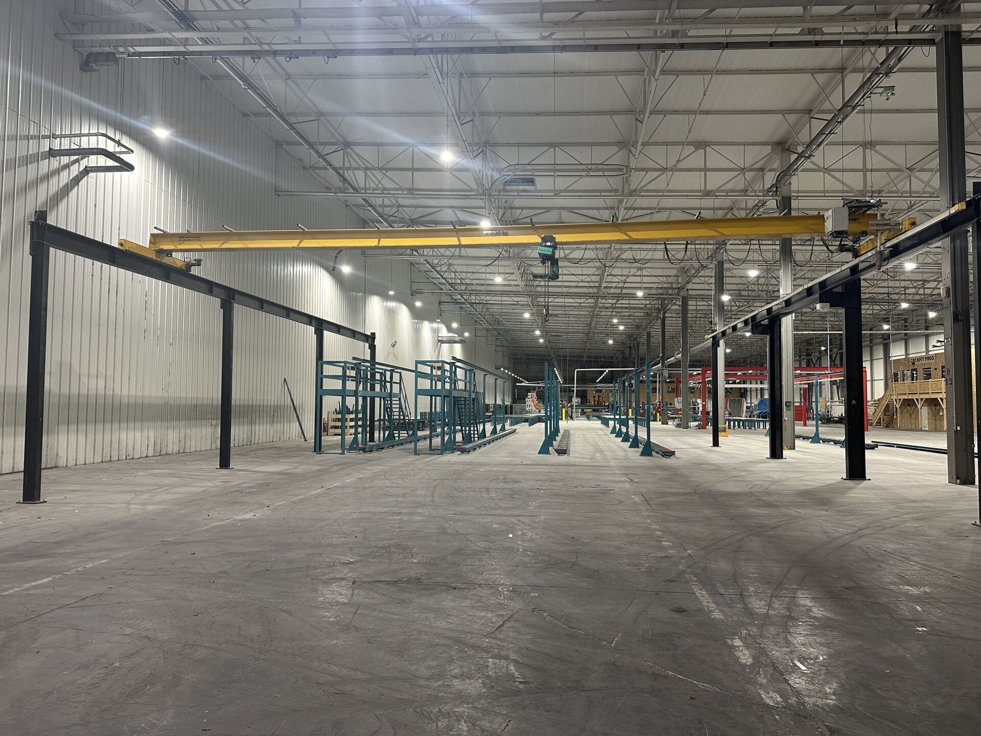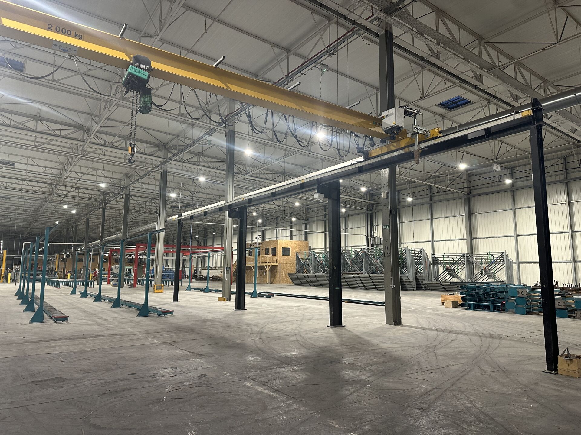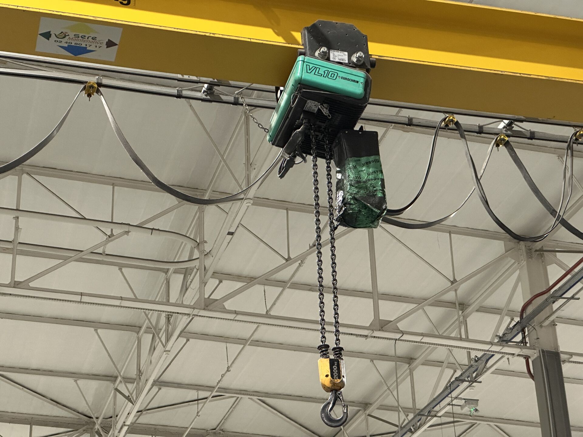 Pont roulant radiocommandé VERLINDE, modèle VL 10, avec chemin de roulement Portée : 14.8 m - Capacité max : 2 T Chemin de roulement indépendant de la structure du bâtiment: Longueur : 18.5 m - Hauteur : 4.3 m sous IPN (8 poteaux)