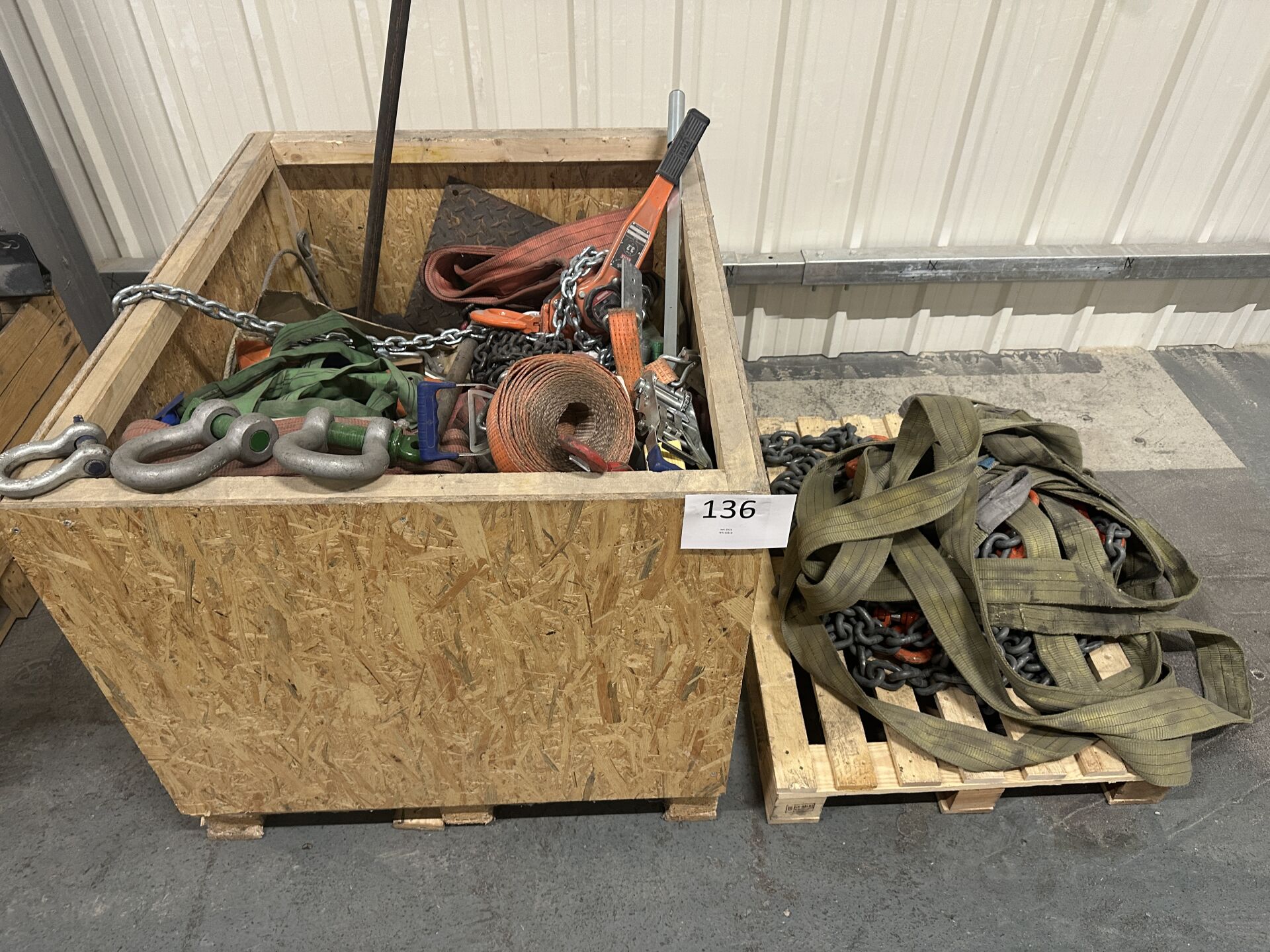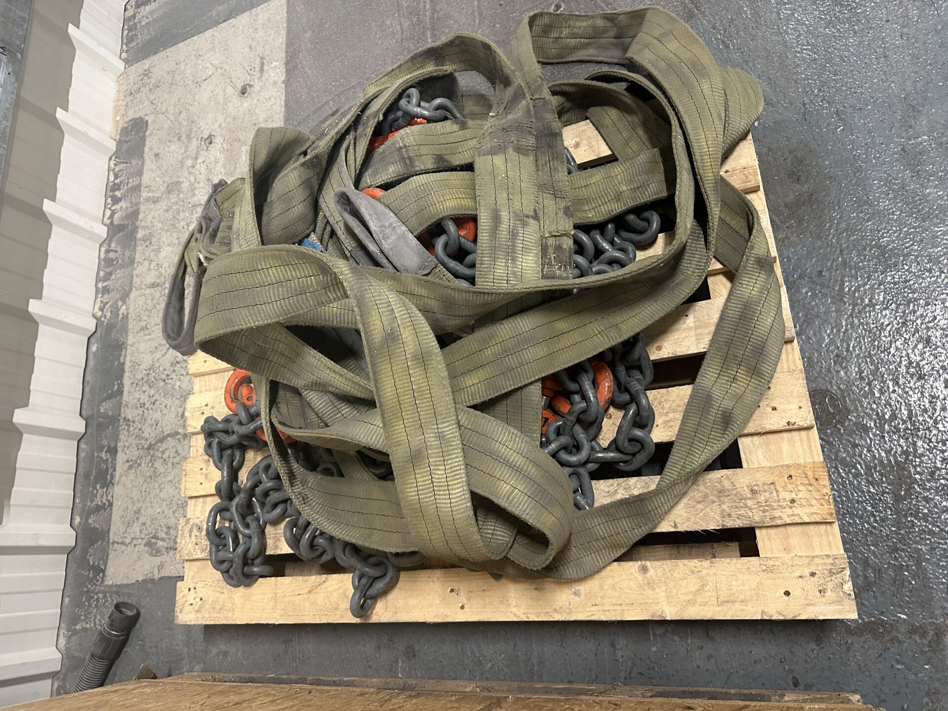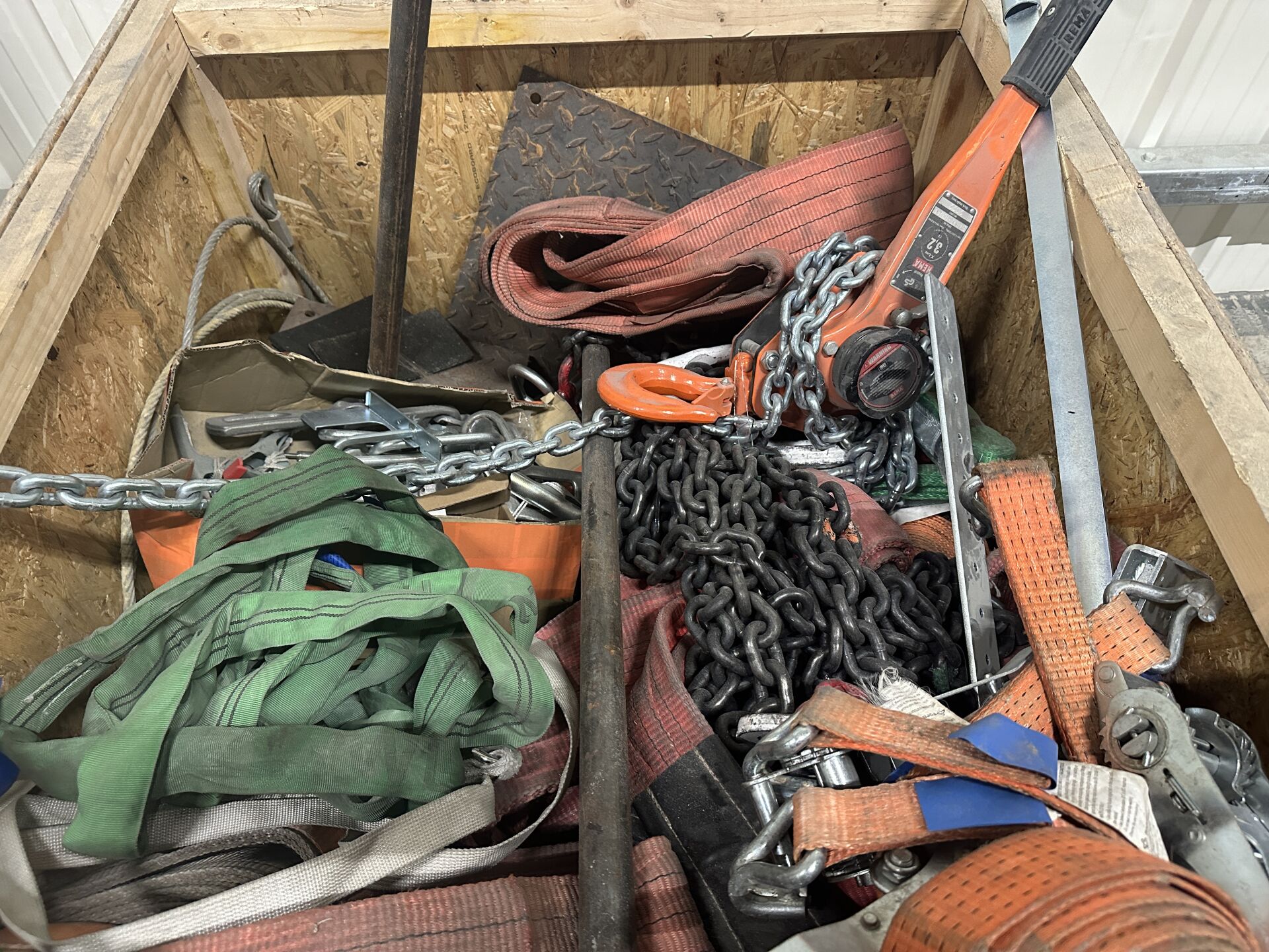 Lot de manilles, crochets, chaînes et sangle de levage, élingues, araignées, sangles à cliquets, 1 palan manuel REMA X-LINE 3.2 T (à chaines) etc ...