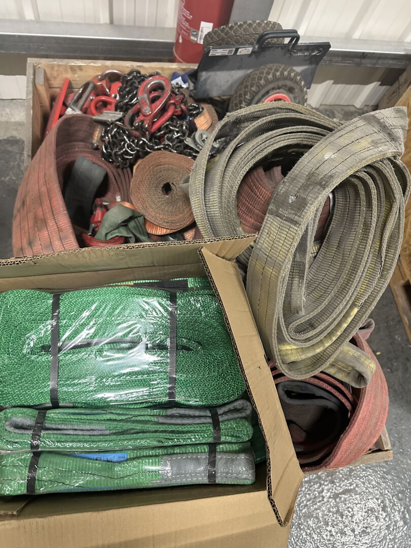 Lot de manilles, crochets, chaînes et sangle de levage, élingues, araignées, sangles à cliquets, etc ...
