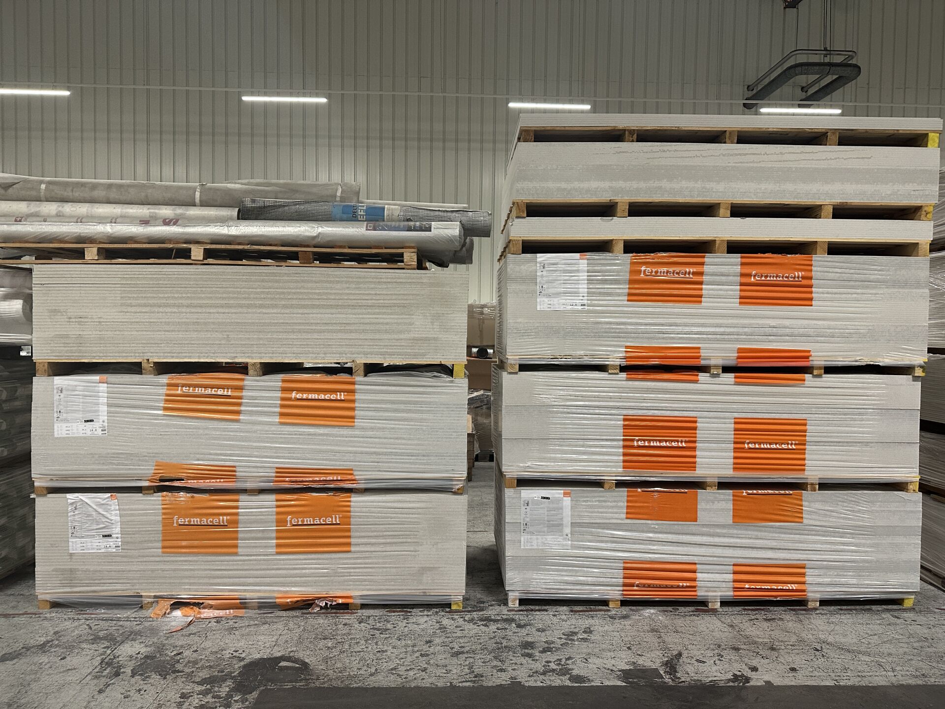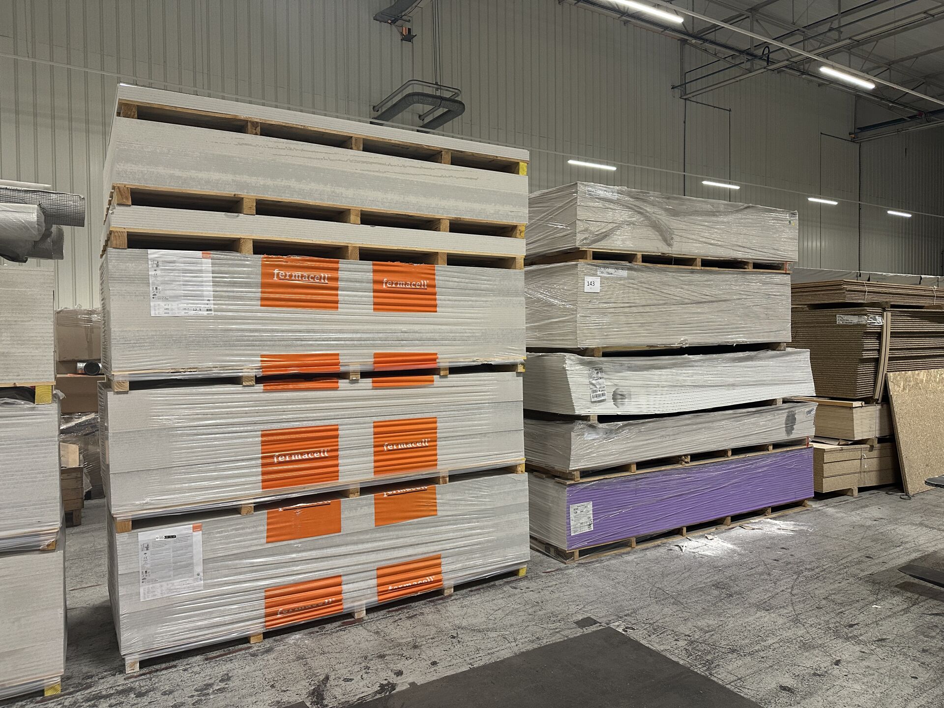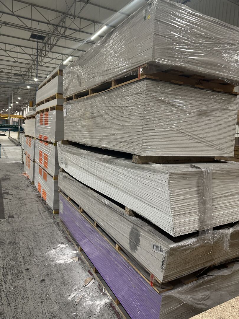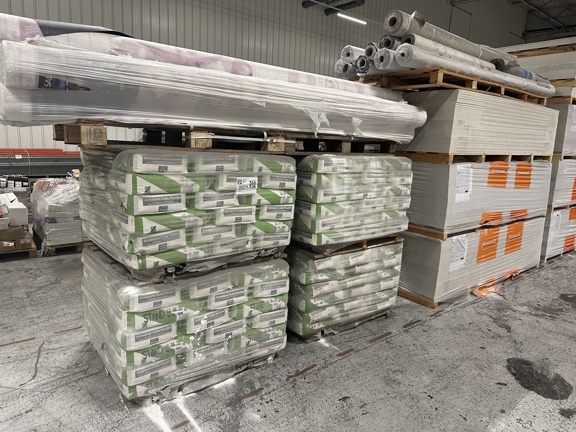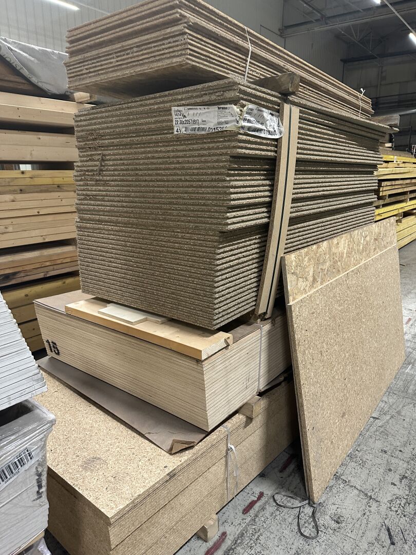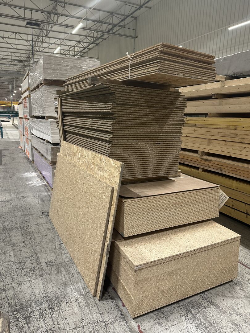 1 lot de 2 palettes de panneaux de bois OSB, 1 palette de contreplaqué marine STARTPLEX, 5 palettes de placo BD13 et BD20, 7 palettes de Fermacell 12,5 et 18 mm. On y joint 4 palettes de sacs de 25kg de mortier colle ARMATERM de 2022