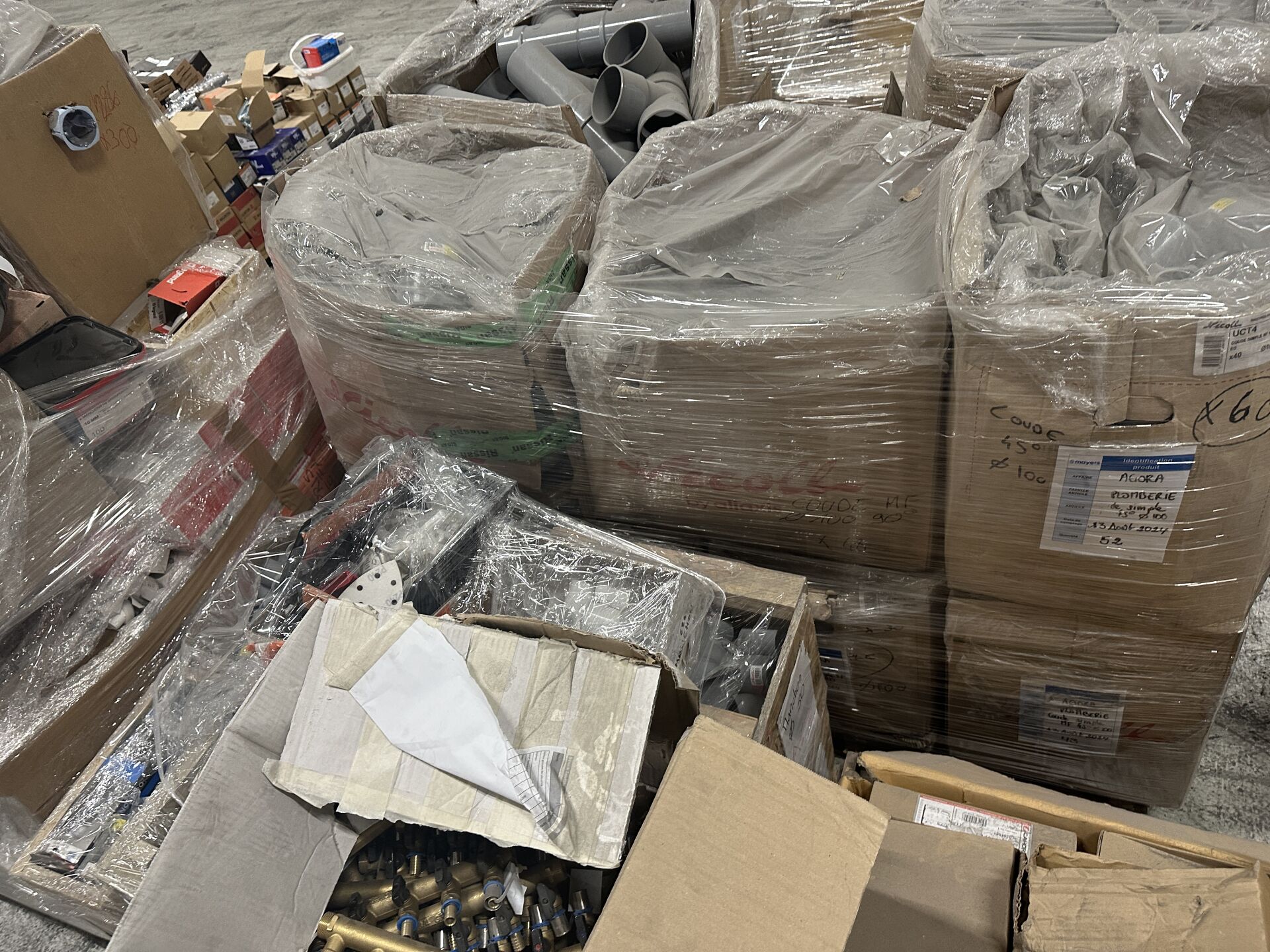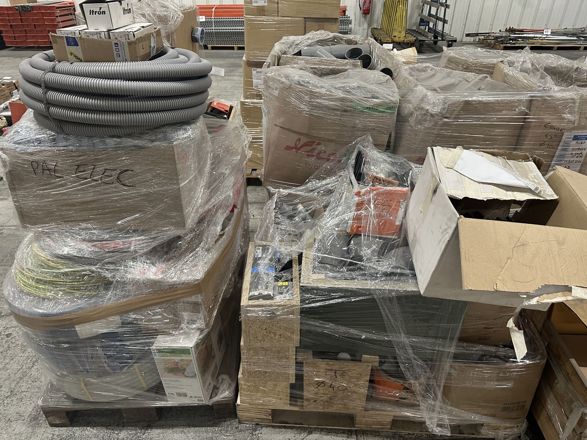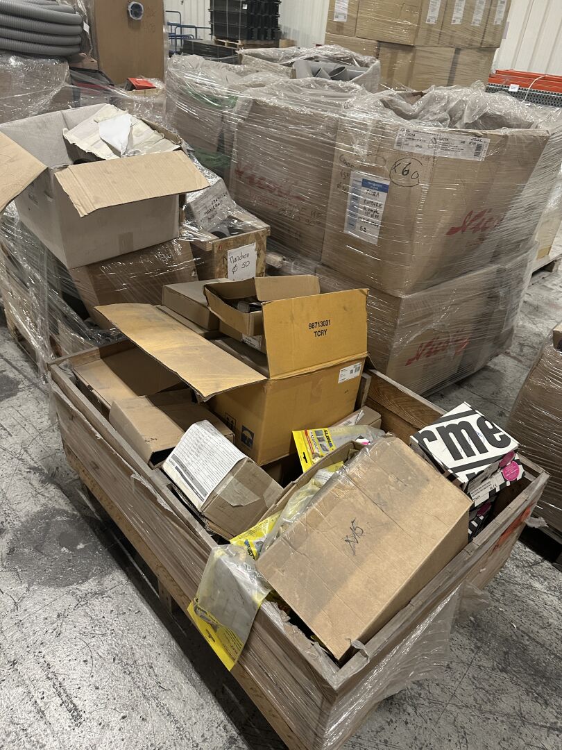 Sur 4 palettes, lot d'accessoires de plomberie et d'électricité dont gaines, câbles elec, accessoires LEGRAND, raccords PVC NICOLL, kits de fixation robinetterie, distributeurs GRK 6 départs diam. 16mm, etc…