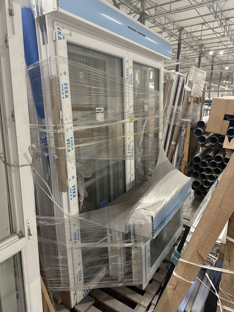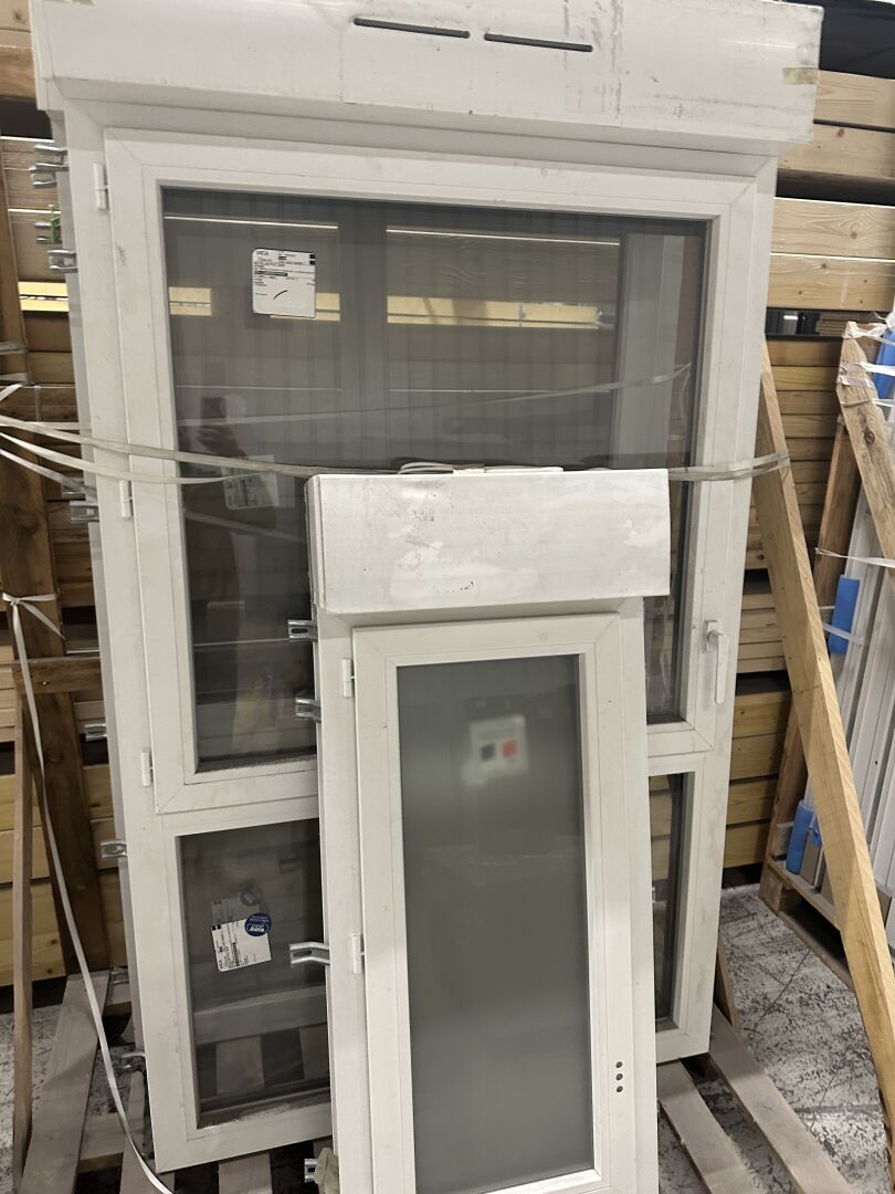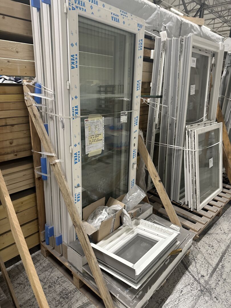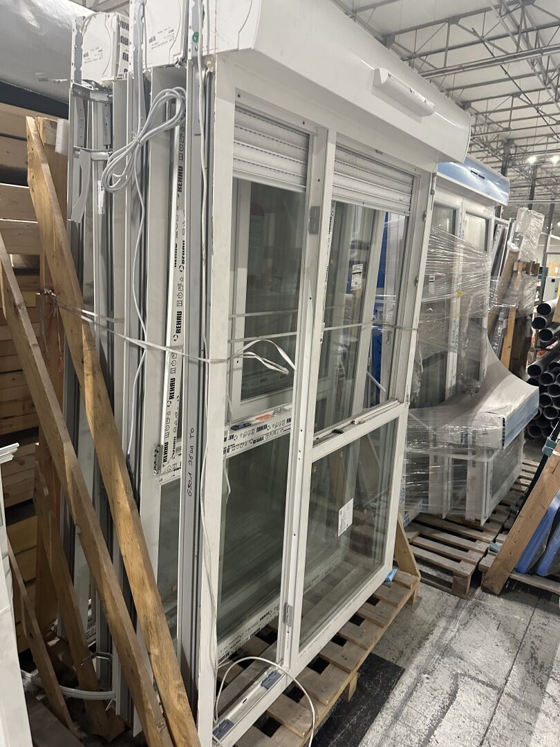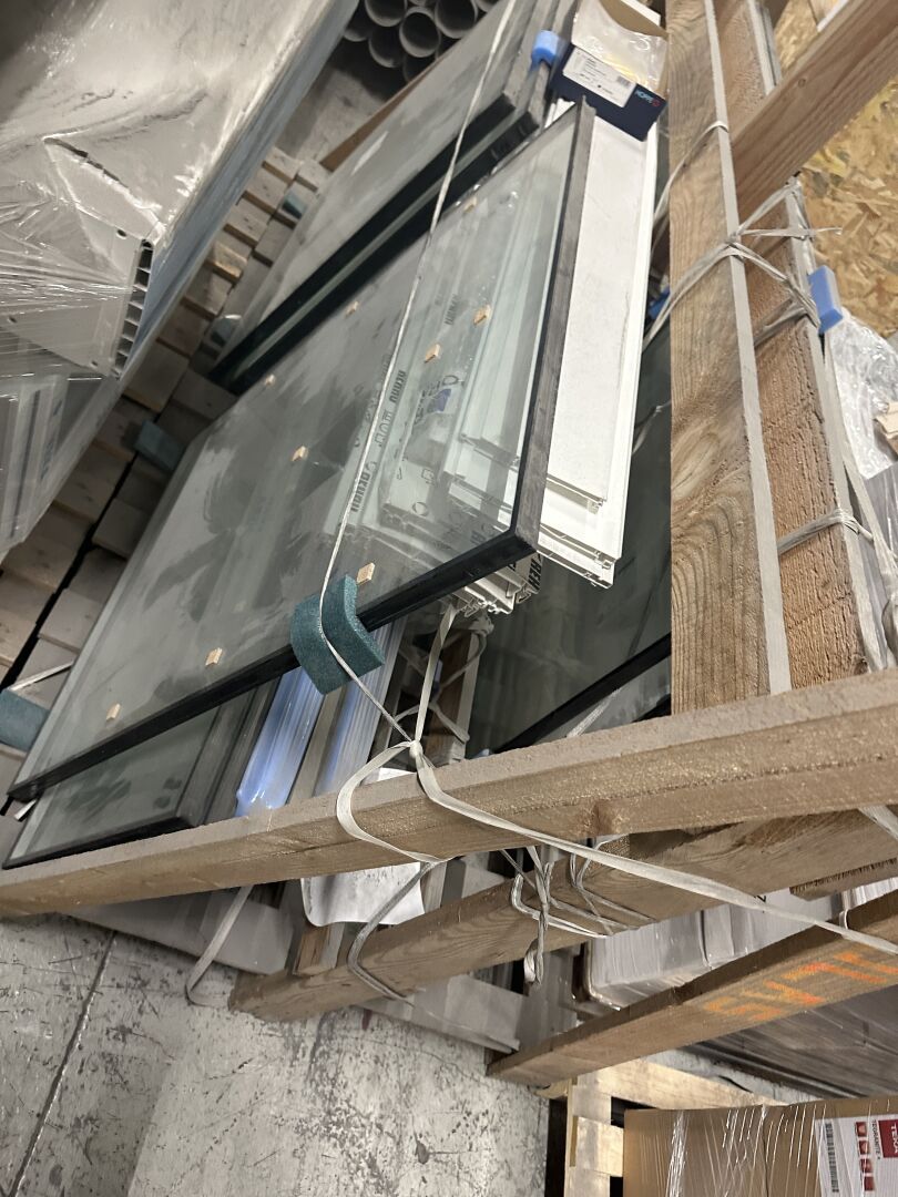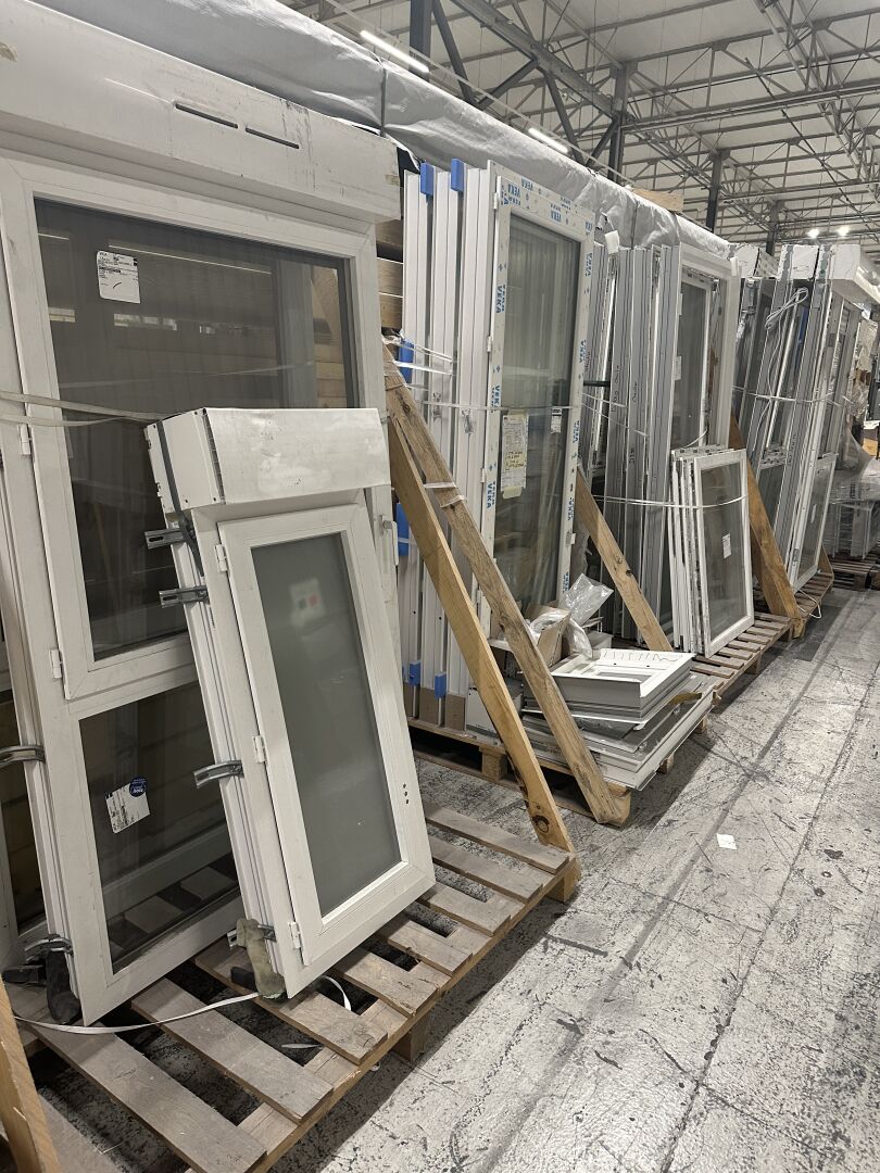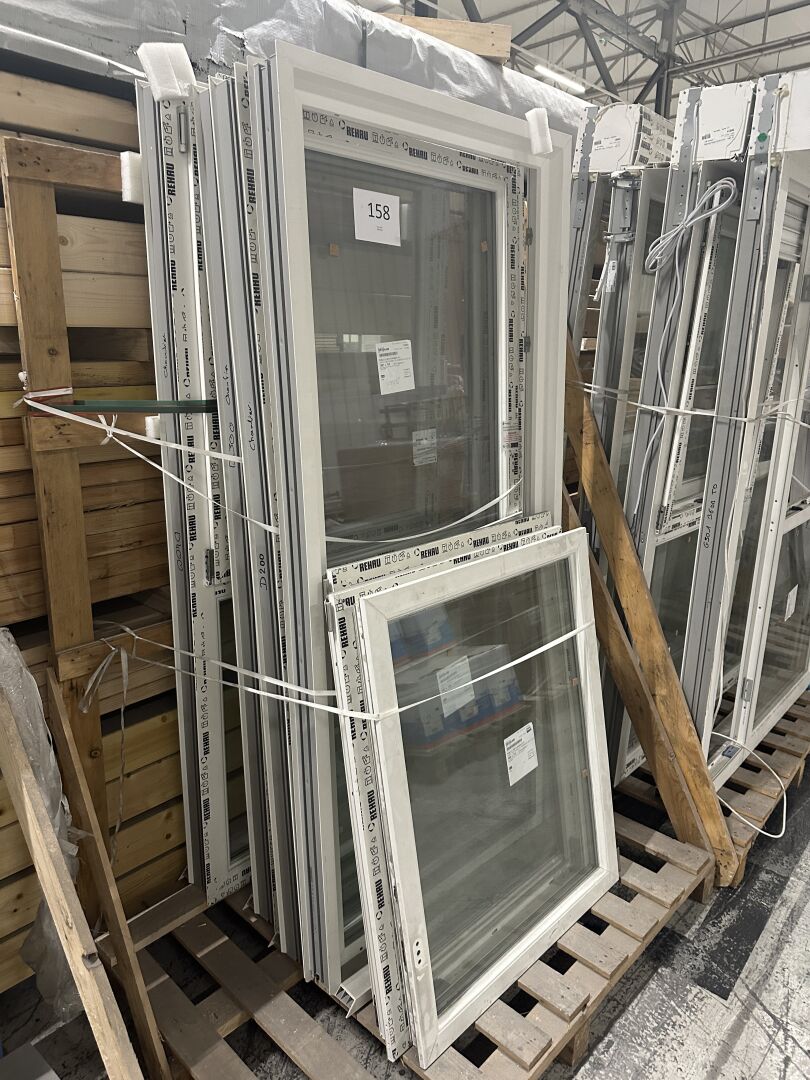 Sur 7 palettes, ensemble d'ouvertures PVC, dont baie 2 vantaux, châssis fixes, portes vitrées, fenêtres oscillo-battantes, etc…(environ 20 unités)