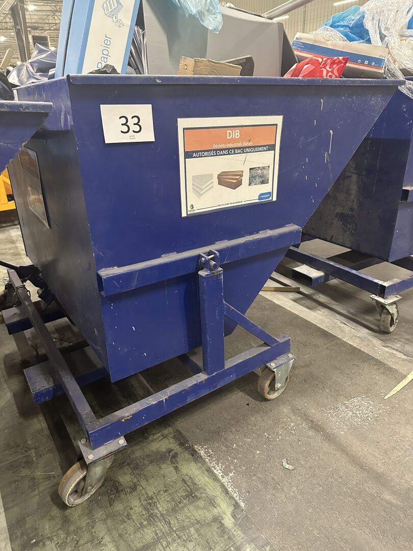 1 benne auto basculante 1320 l en métal laqué bleu type BAD P1320 R, PAV 241 kg, CU 1 T