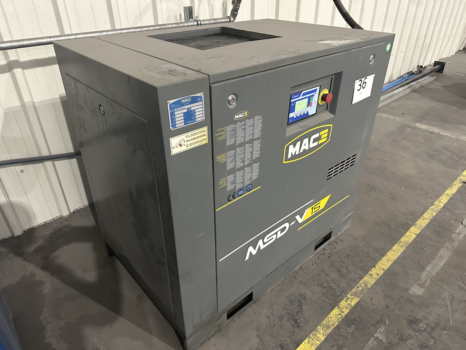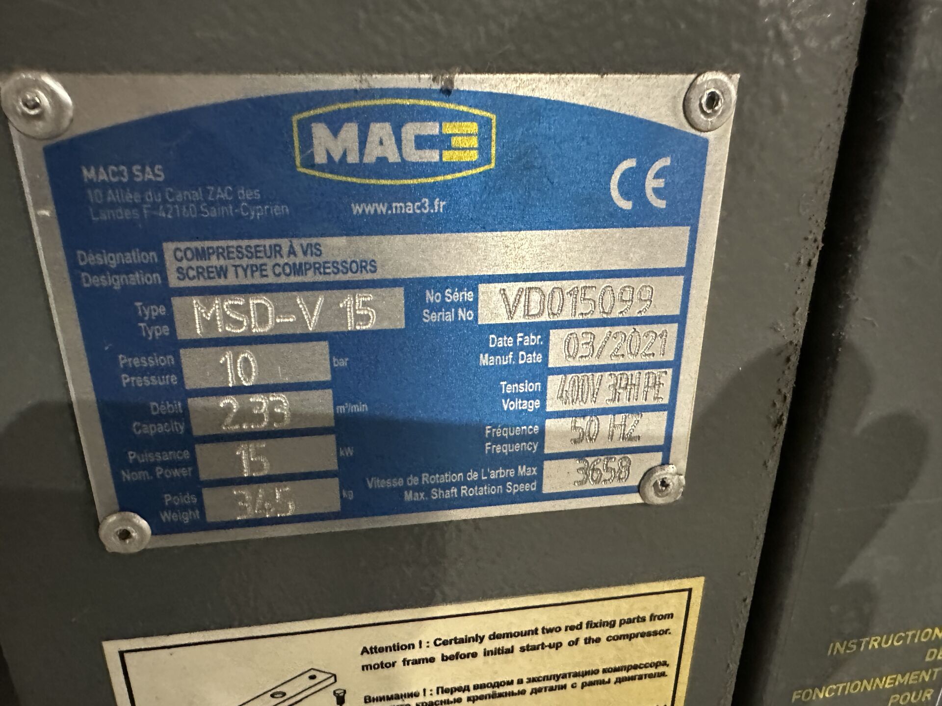 1 compresseur MAC 3, modèle MSD - V 15, de mars 2021 Compteur : 8722 h de marche, NS : VD 015099