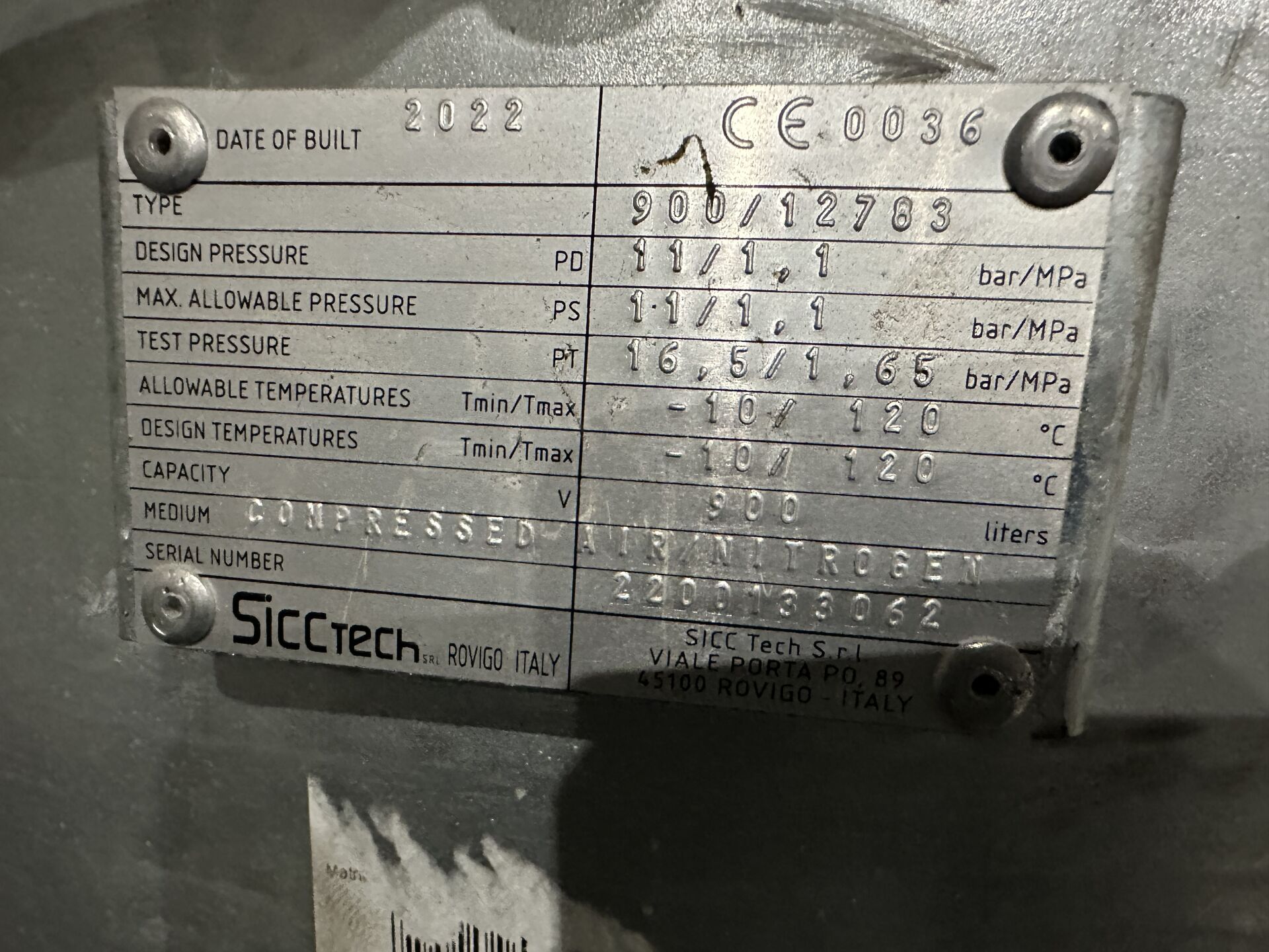 1 cuve tampon SICCTECM, modèle 900/12788 de 900 l SOUS RESERVES : Réseau d'air comprimé d'environ 230 m linéaires