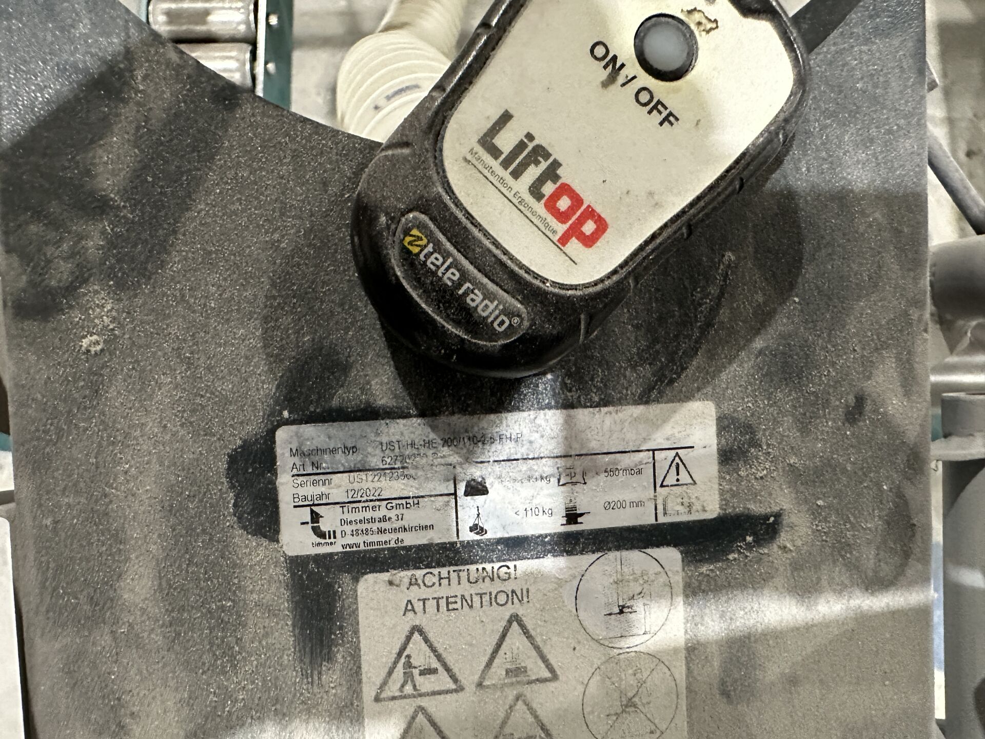 1 palonnier à 4 ventouses LIFTOP, modèle USTV HL-HE-200/110-2 5-FH-P , CMU 100 kg, de 2022 NS : UST 22112336 avec stop-chute PREVOST 4060 B de 2023