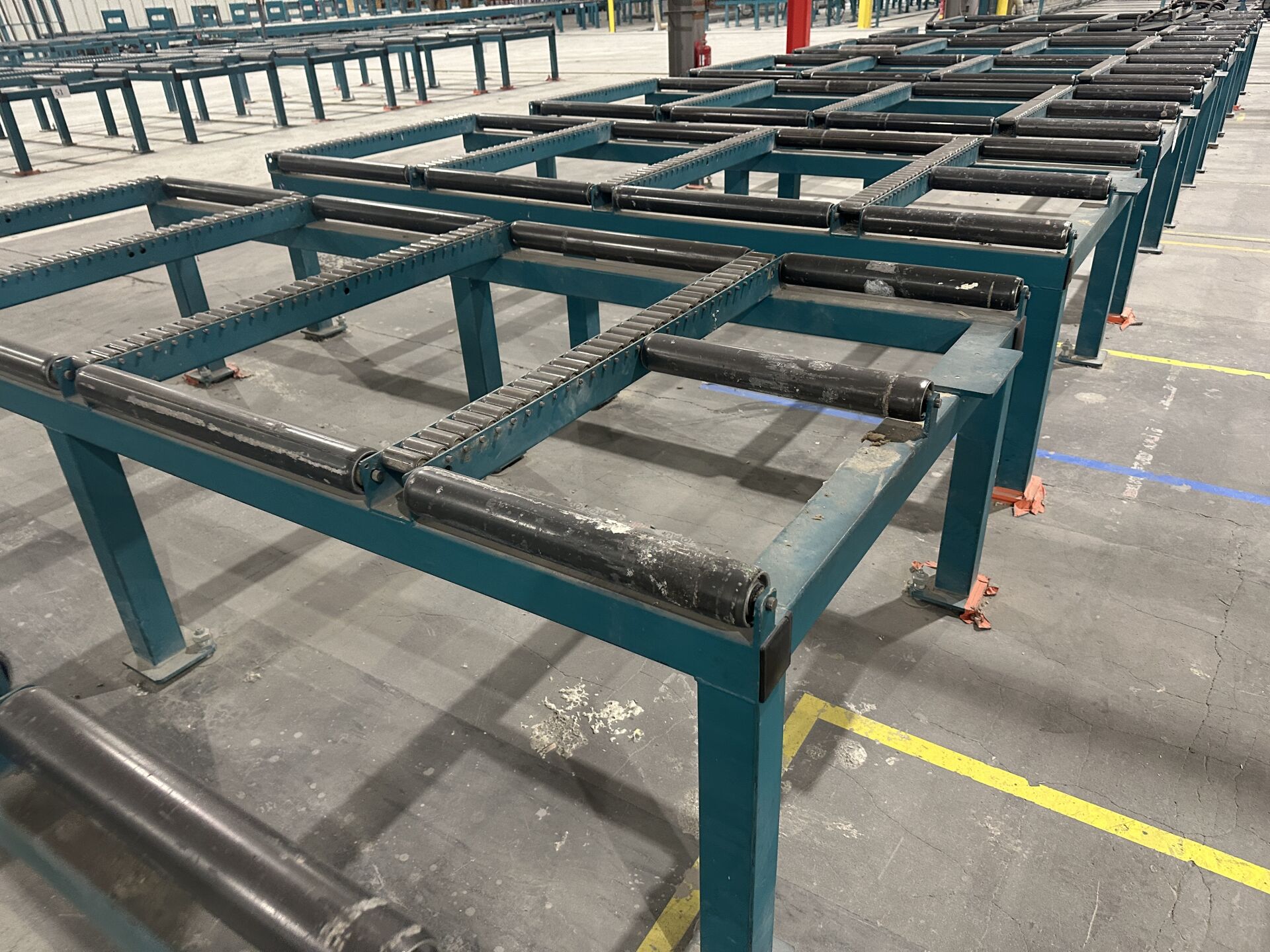 8 tables à convoyeurs à rouleaux en métal laqué bleu, 120 x 300 cm