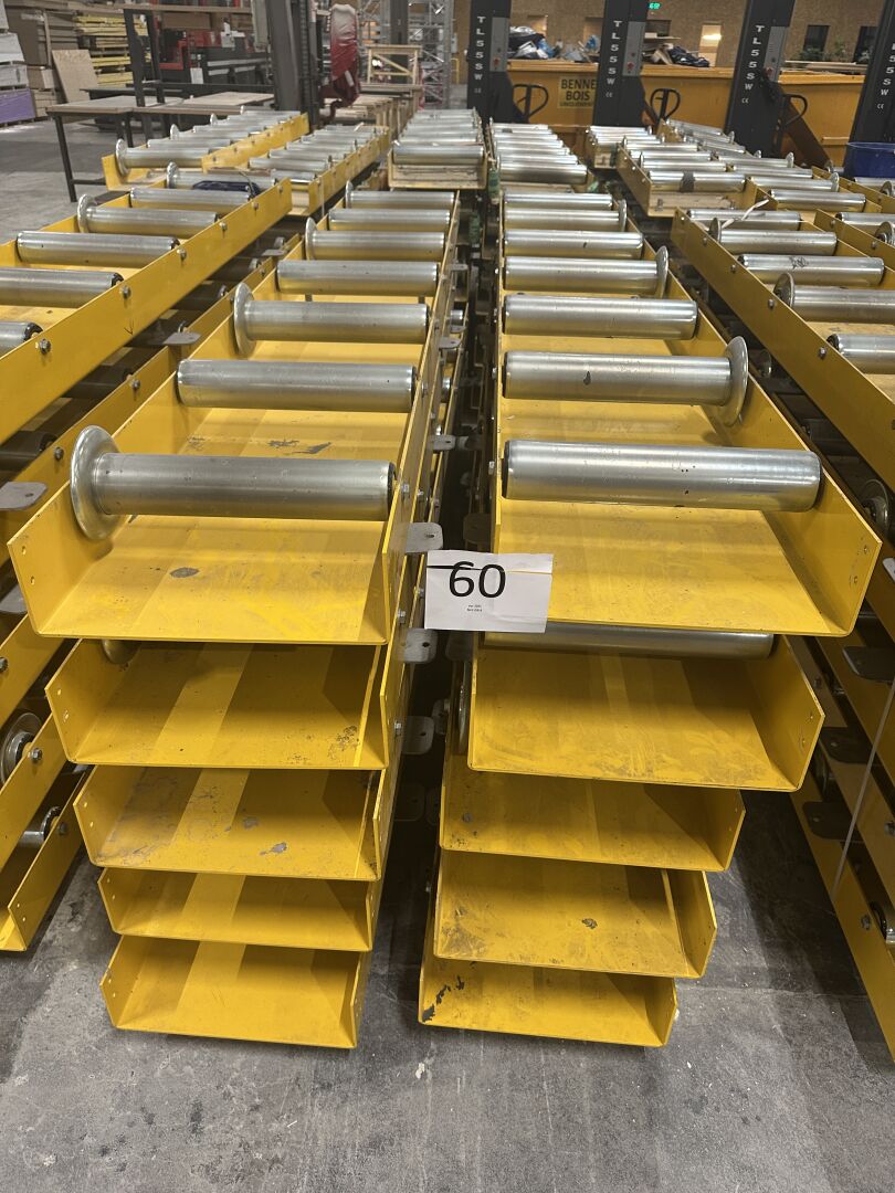 20 convoyeurs à rouleaux métal laqué jaune en longueur 280 cm