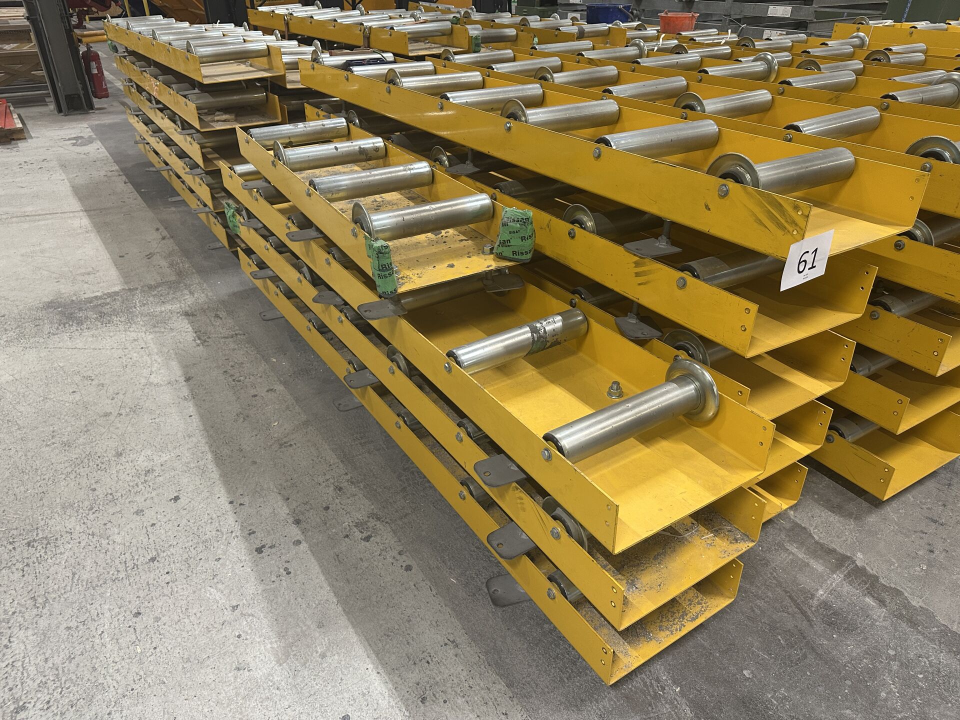 19 convoyeurs à rouleaux métal laqué jaune : 18 en longueur 280 cm et 1 en 160 cm