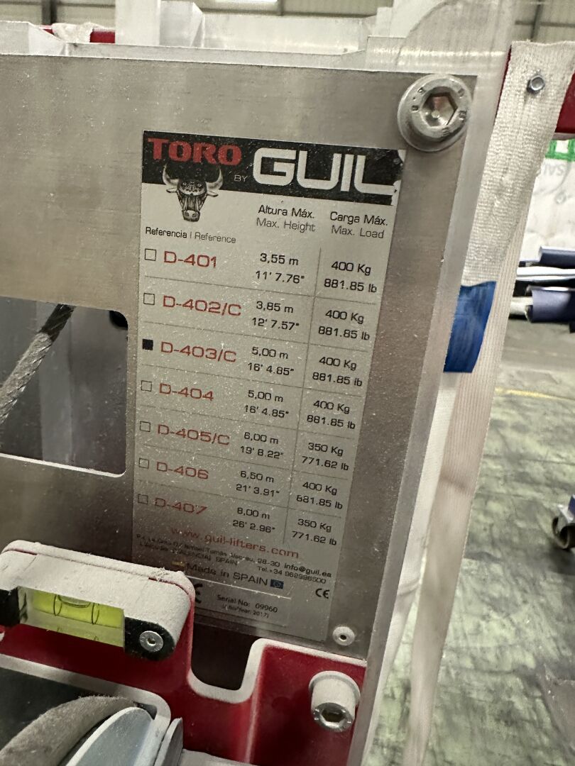 1 monte-charge à colonne TORO GUIL D-403/C hauteur max 5 m, charge max 400 kg, ns 09960, de 2017