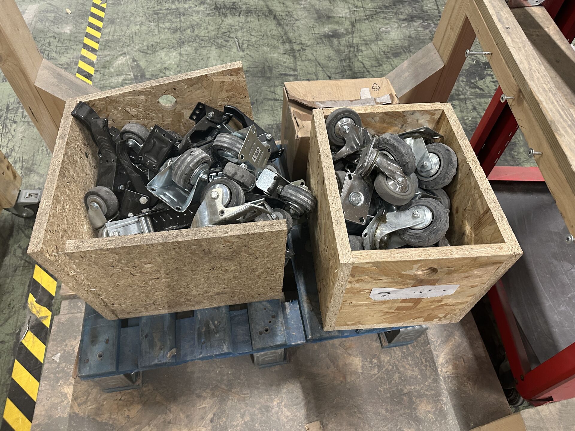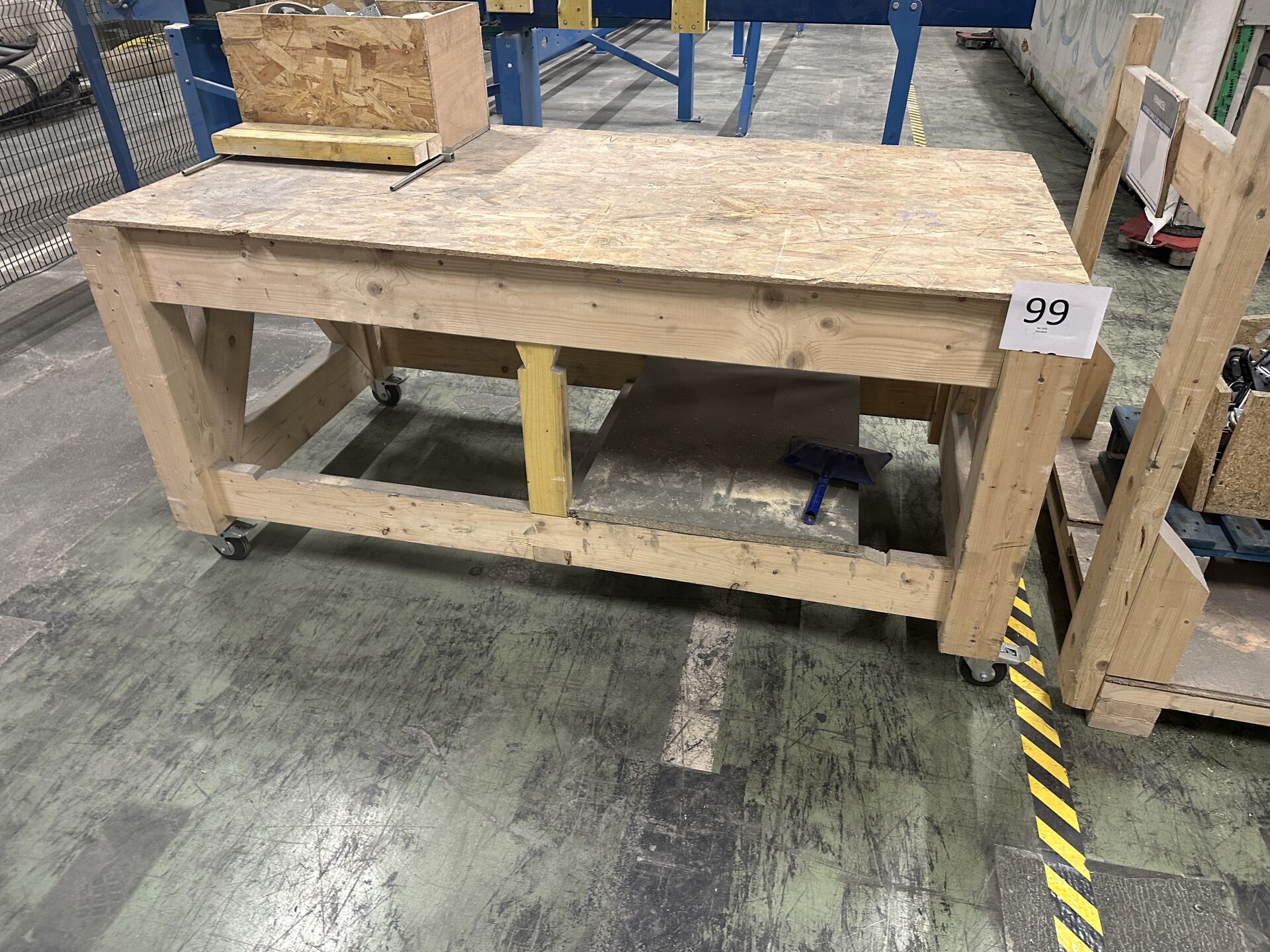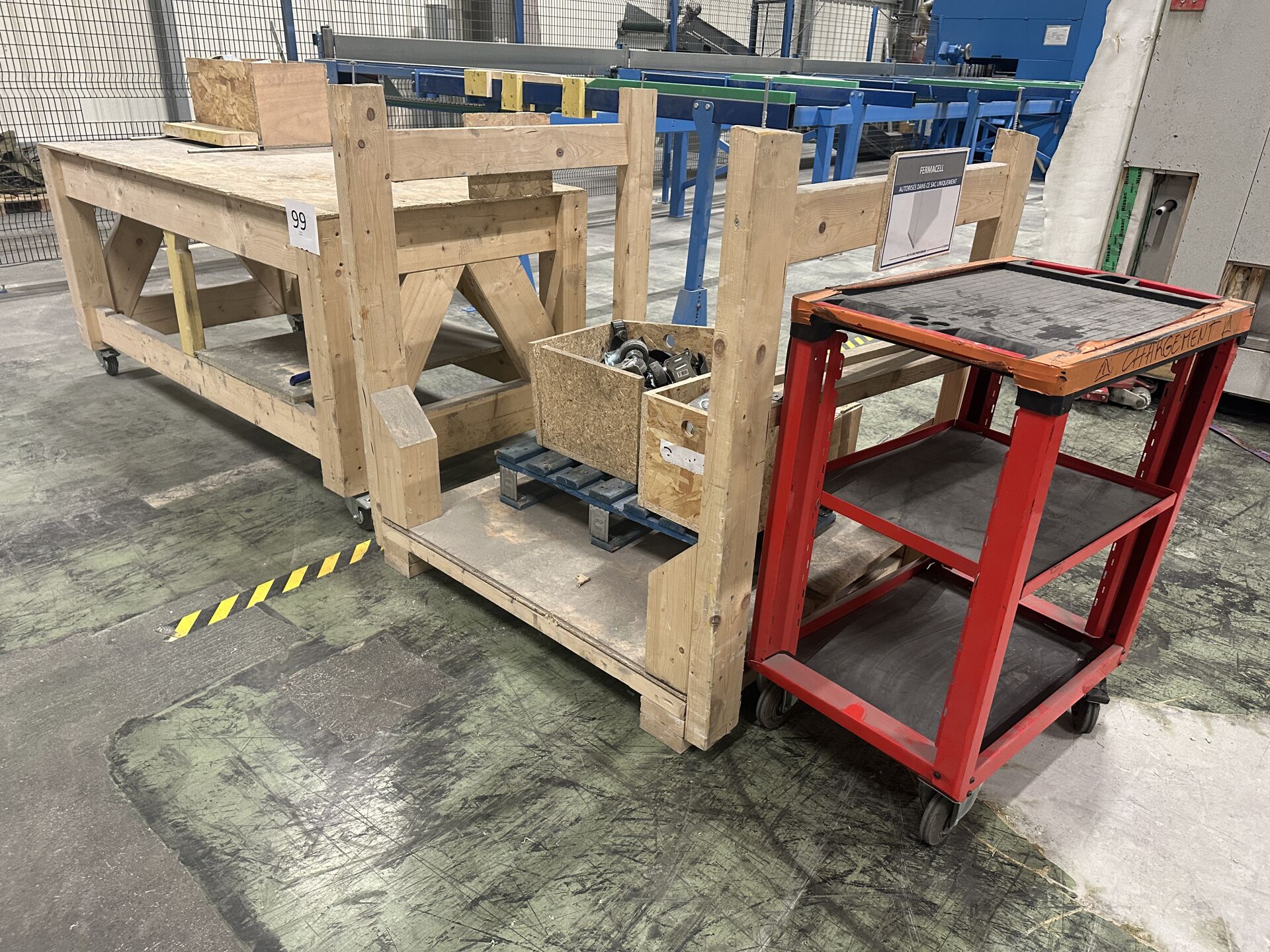 1 établi en bois naturel, fabrication artisanale 200 x 100 cm, avec 1 ratelier bois fabrication artisanale , avec contenu de roulettes pour chariots, on y joint 1 desserte roulante métal rouge à 3 niveaux
