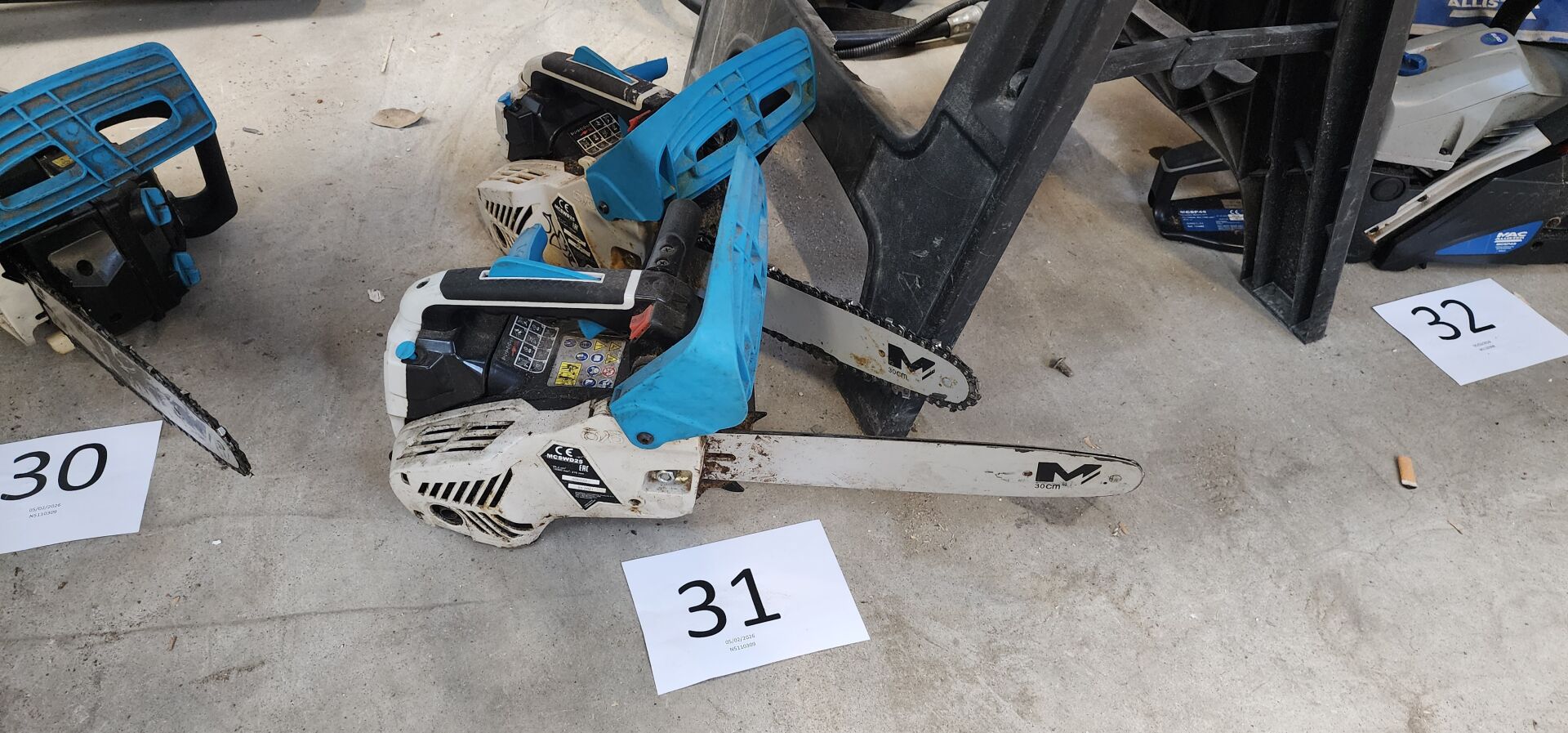 2 tronçonneuses chaine thermique MAC ALLISTER type MCSWD25 dont 1 poignée cassée et l'autre manquante