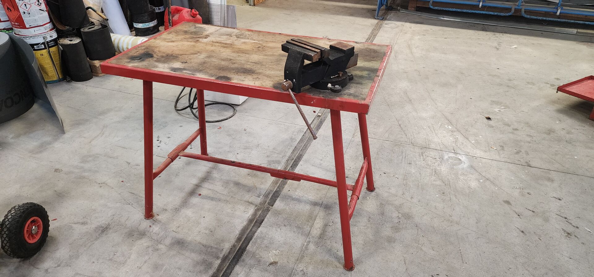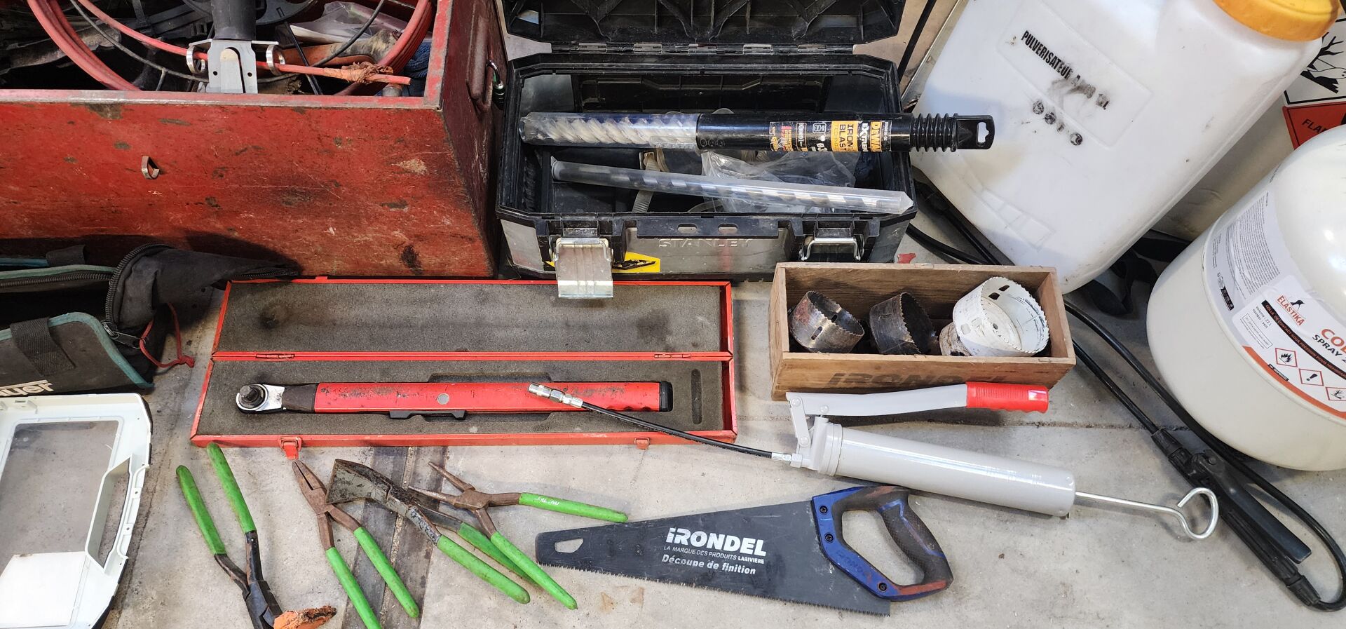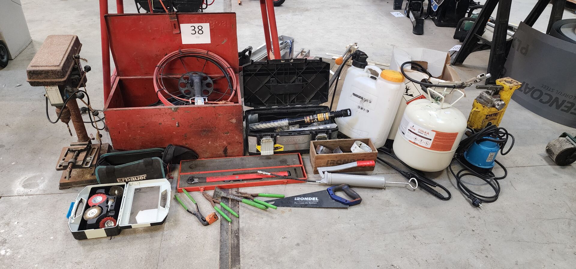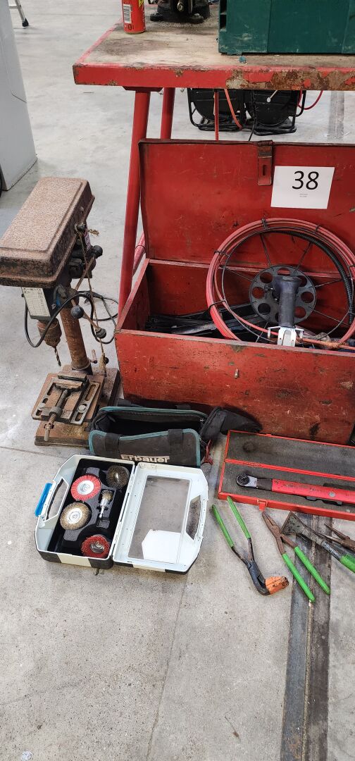 1 perceuse d'établi CRAFTEX (état moyen) corrodée 1 établi de chantier pliable avec étau , 1 ensemble d'outillage manuel 1 caisse à outils métal rouge 1 caisse à outils STANLEY PVC, 1 pulvérisateur 12 L, 1 scie cloche, 1 bonbone de colle 22 L pulvérisable, 1 cric hydraulique VICTORY 5T, 1 pompe vide-cave PENTAIR etc