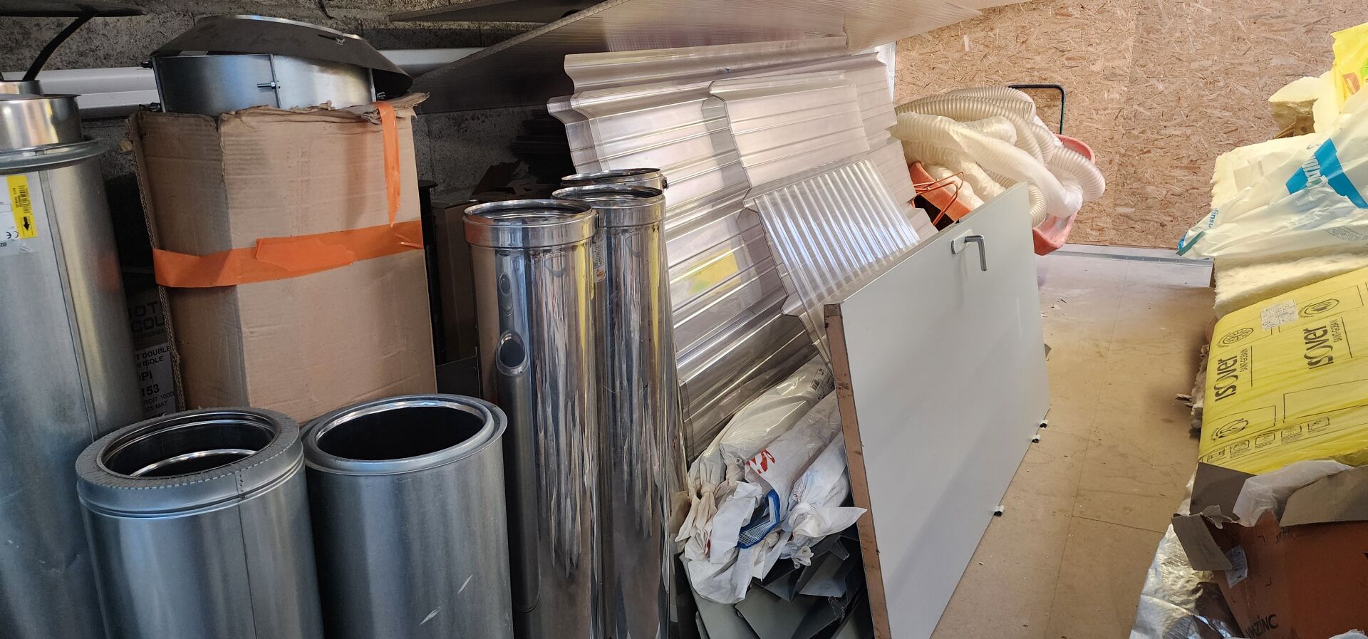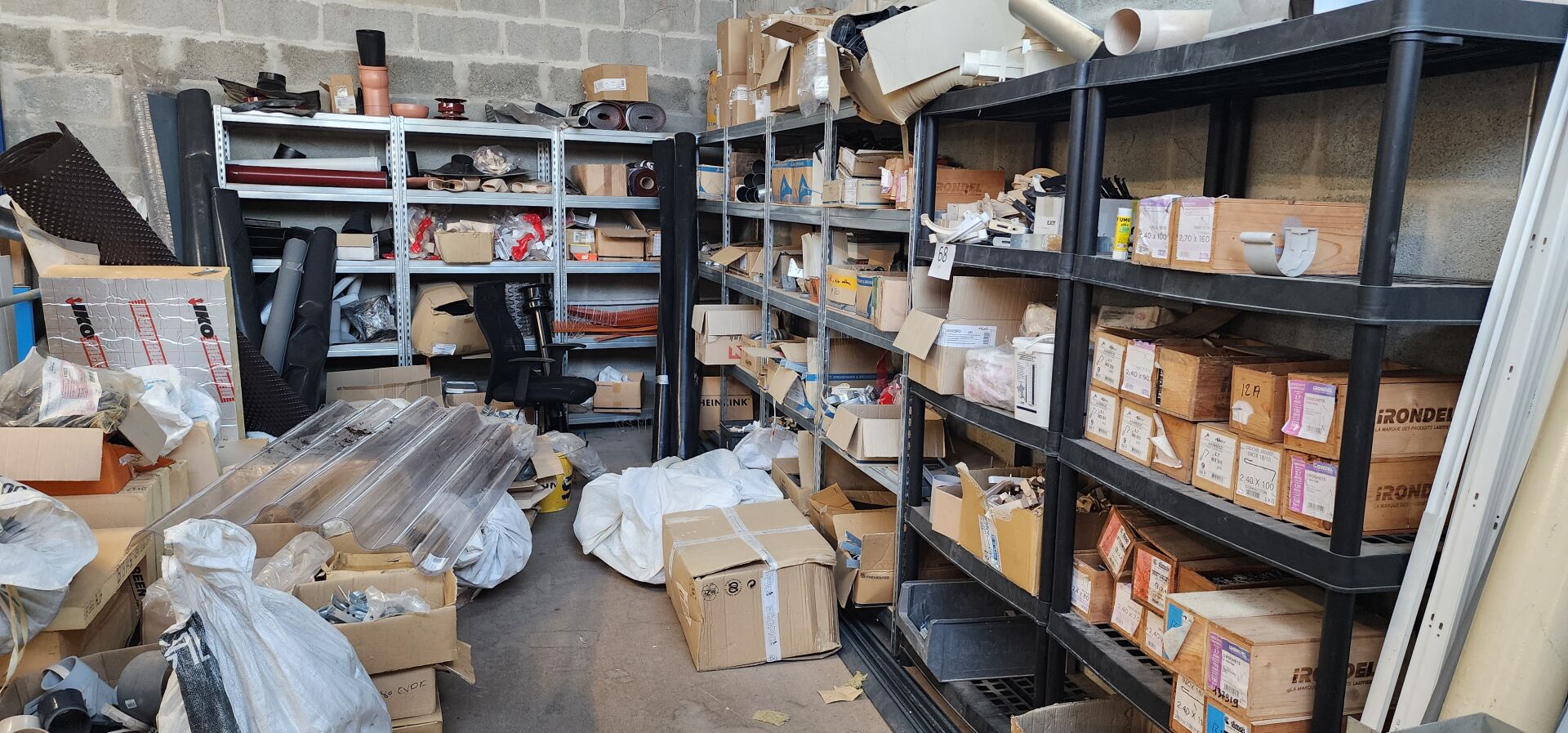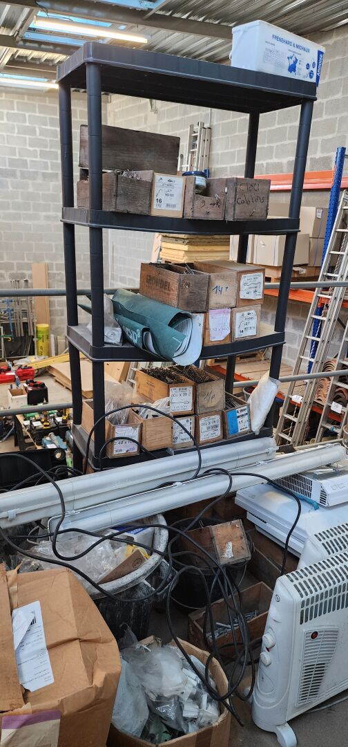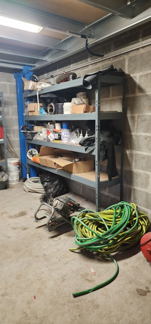sur mezzanine : 1 stock de quincaillerie pour la couverture dont crochets pour ardoises et tuiles, crochets de gouttière galva ou PVC, raccords de gouttière , stop-piafs, membrane PVC, 8 tuyaux galva POUJOULAT différents diamètres etc Le contenu d'une réserve : retours de chantier , consommables etc 1 petit compresseur sur cuve rouge (rebuté, déclaré hors-service) 3 étagères en métal gris, à 3 plateaux