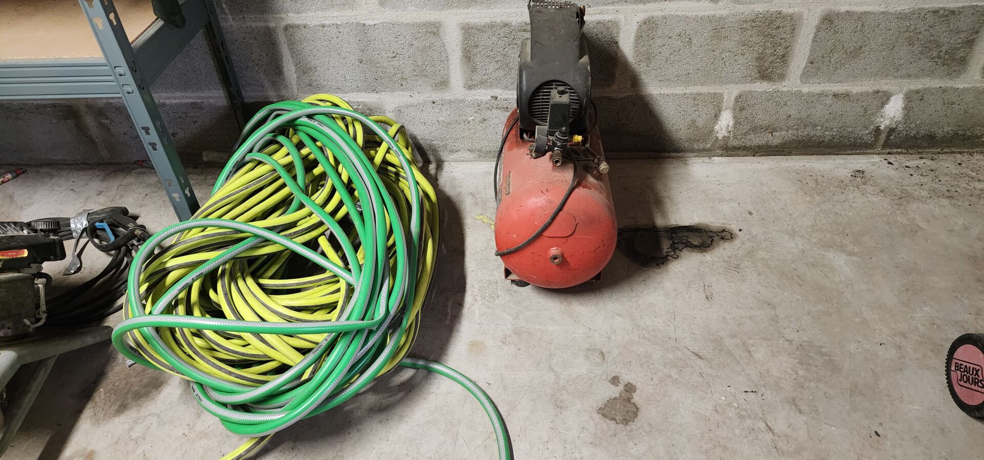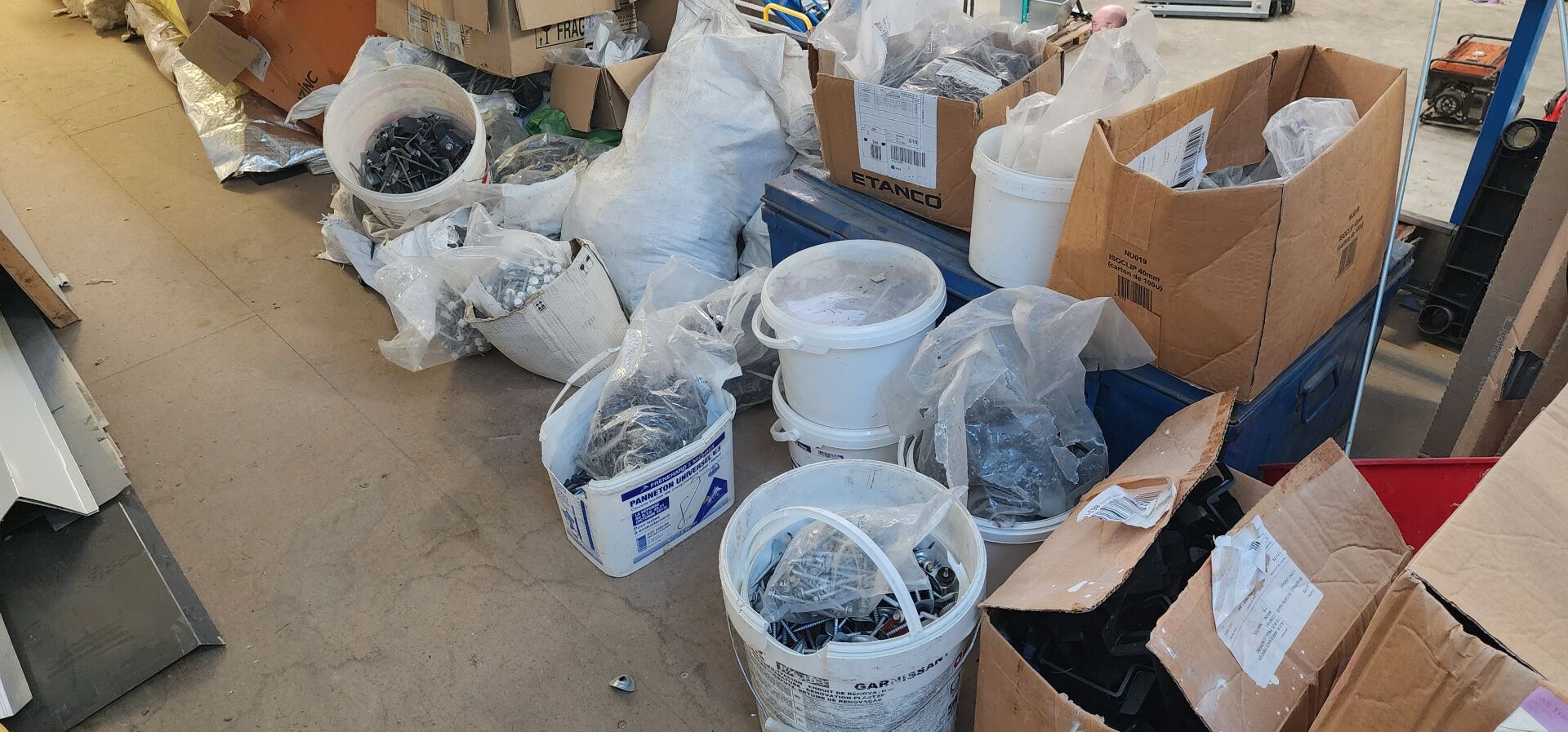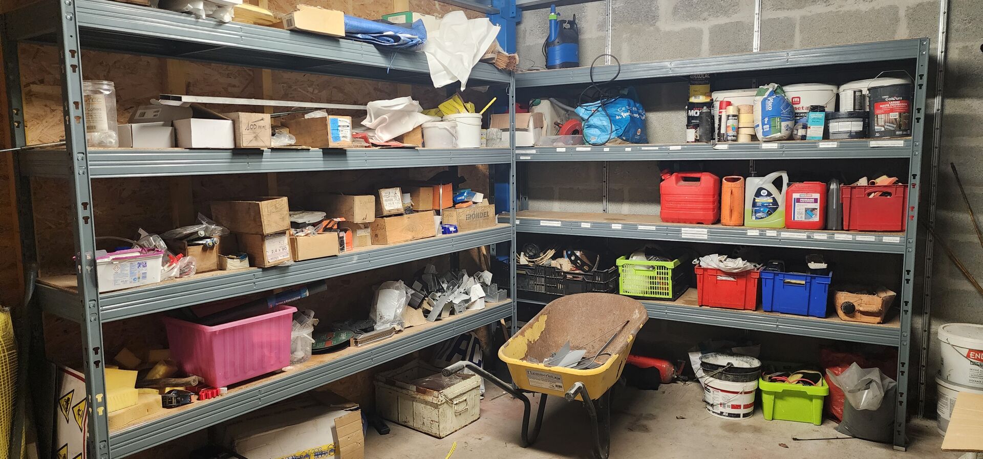 sur mezzanine : 1 stock de quincaillerie pour la couverture dont crochets pour ardoises et tuiles, crochets de gouttière galva ou PVC, raccords de gouttière , stop-piafs, membrane PVC, 8 tuyaux galva POUJOULAT différents diamètres etc Le contenu d'une réserve : retours de chantier , consommables etc 1 petit compresseur sur cuve rouge (rebuté, déclaré hors-service) 3 étagères en métal gris, à 3 plateaux