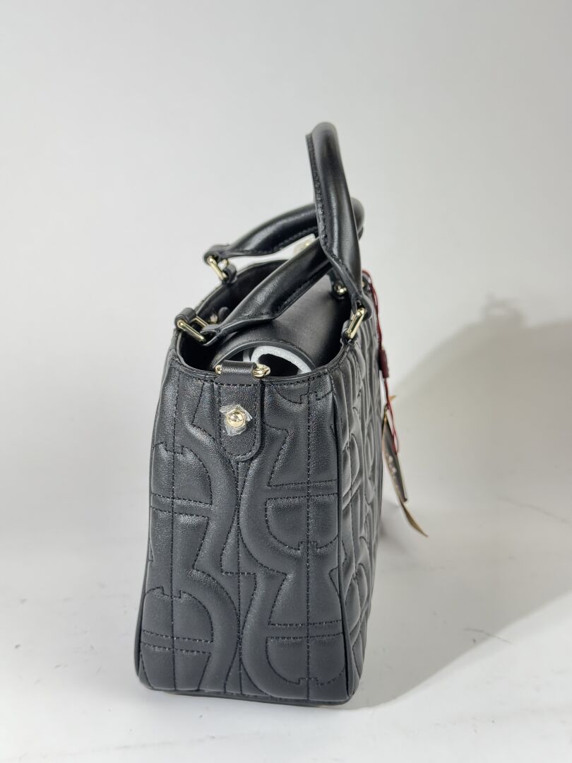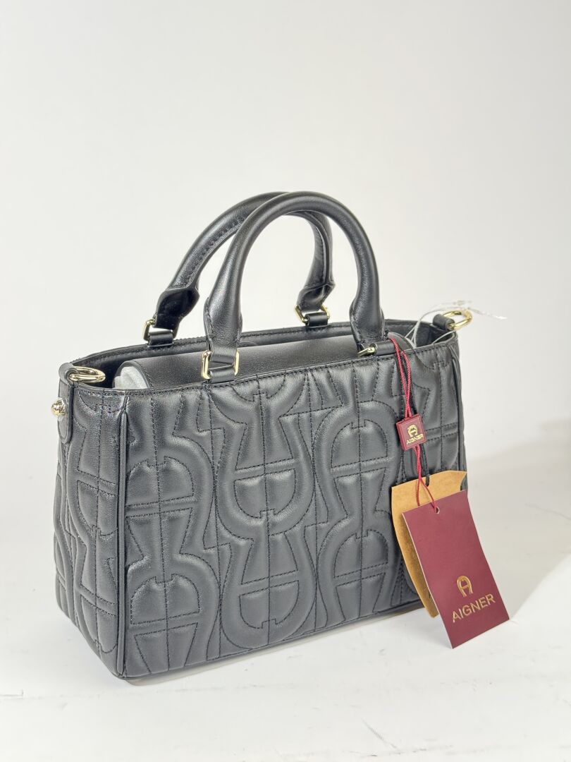 AIGNER - Sac à main en cuir noir, effet matelassé au sigle de la maison, deux poignées, fermeture aimantée, anse bandoulière chaine métal doré. Haut. : 16,5 cm - Long. : 24,5 cm Etat magasin