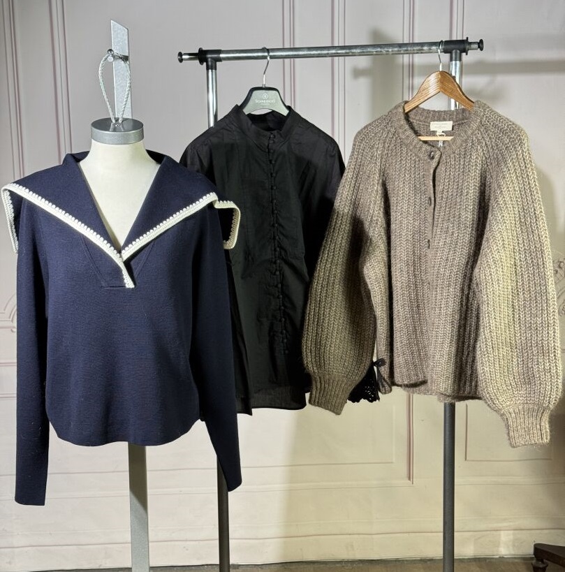 SEZANE - Lot comprenant un pull modèle "Naya" en laine mérinos marine et détails blancs (taille XL), un cardigan modèle "Emile", mailles fantaisie taupe foncé, manches longues (taille indiquée XXL) et un chemisier modèle "Faria" en coton noir, boutonnage sous bride, manches longues, détail en guipure (taille 40). Etat magasin