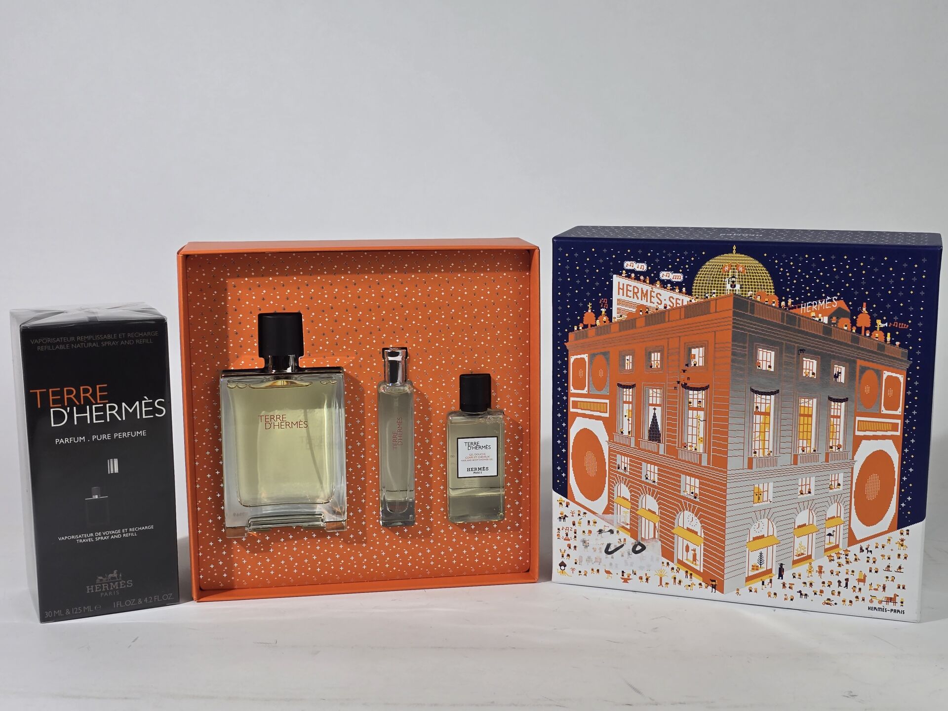 HERMES - "Terre d'Hermès" : Coffret comprenant une eau de toilette 100 ml et une eau de toilette 15 ml, un gel douche 40 ml et un parfum vaporisateur de voyage 30 ml avec sa recharge de 125 ml.