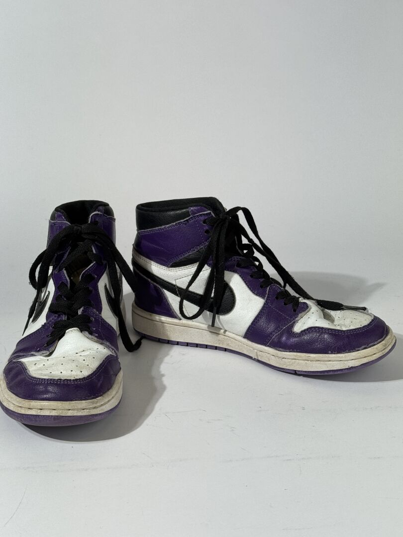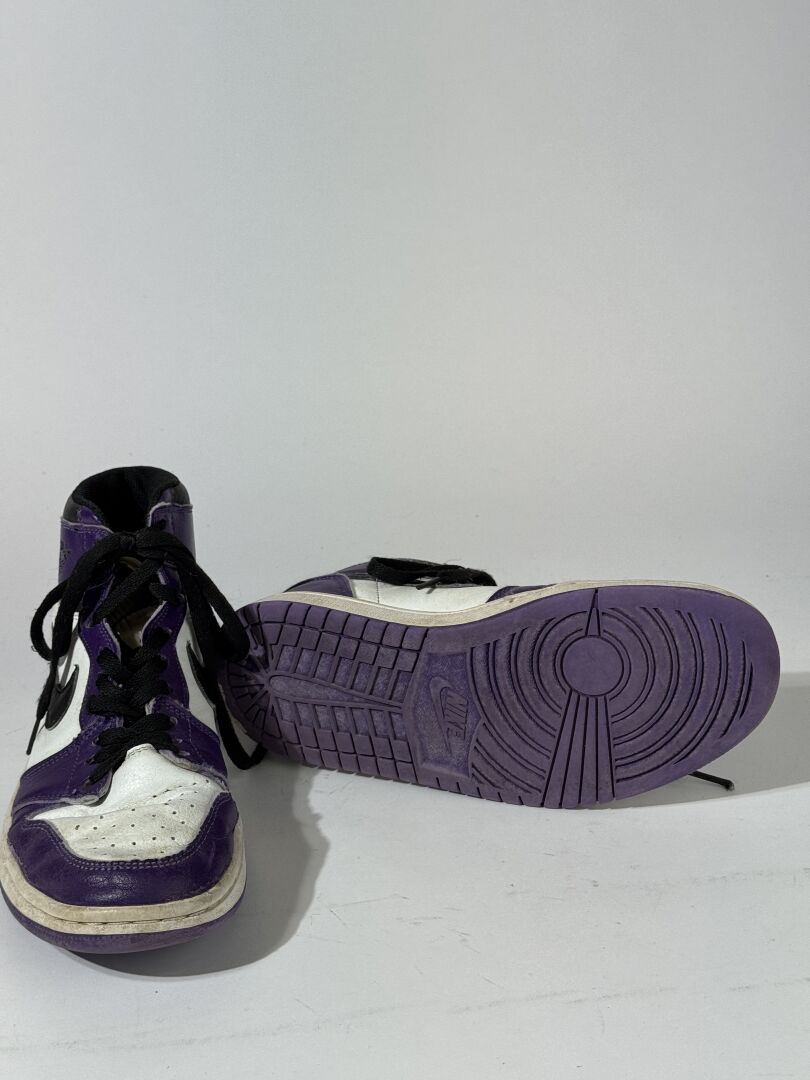 NIKE AIR JORDAN - Paire de sneakers en cuir blanc et violet, lacets. Pointure indiquée 38 Déjà portée
