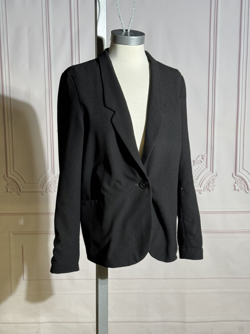 ANGE - Blazer en jersey noir, petit col cranté sur simple boutonnage, deux poches, manches longues. Taille 1 Déjà porté, quelques usures