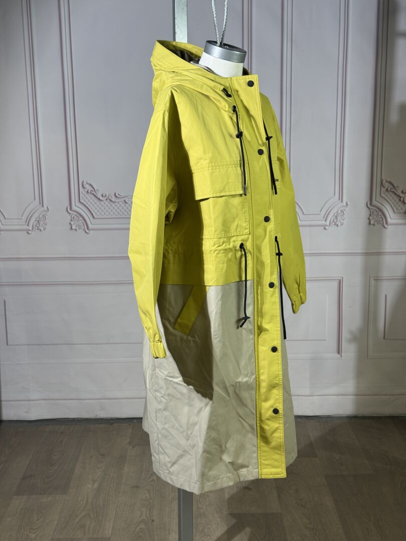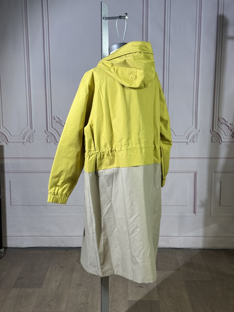 BARBOUR - Parka modèle "Evie Showerproof", coton et polyamide jaune et sable, fermeture à glissière à double curseur sous patte à pression, deux poches à rabat poitrine, deux poches en biais, manches longues, capuche. Taille 36 Etat magasin