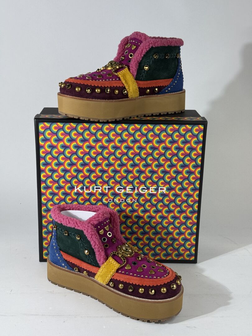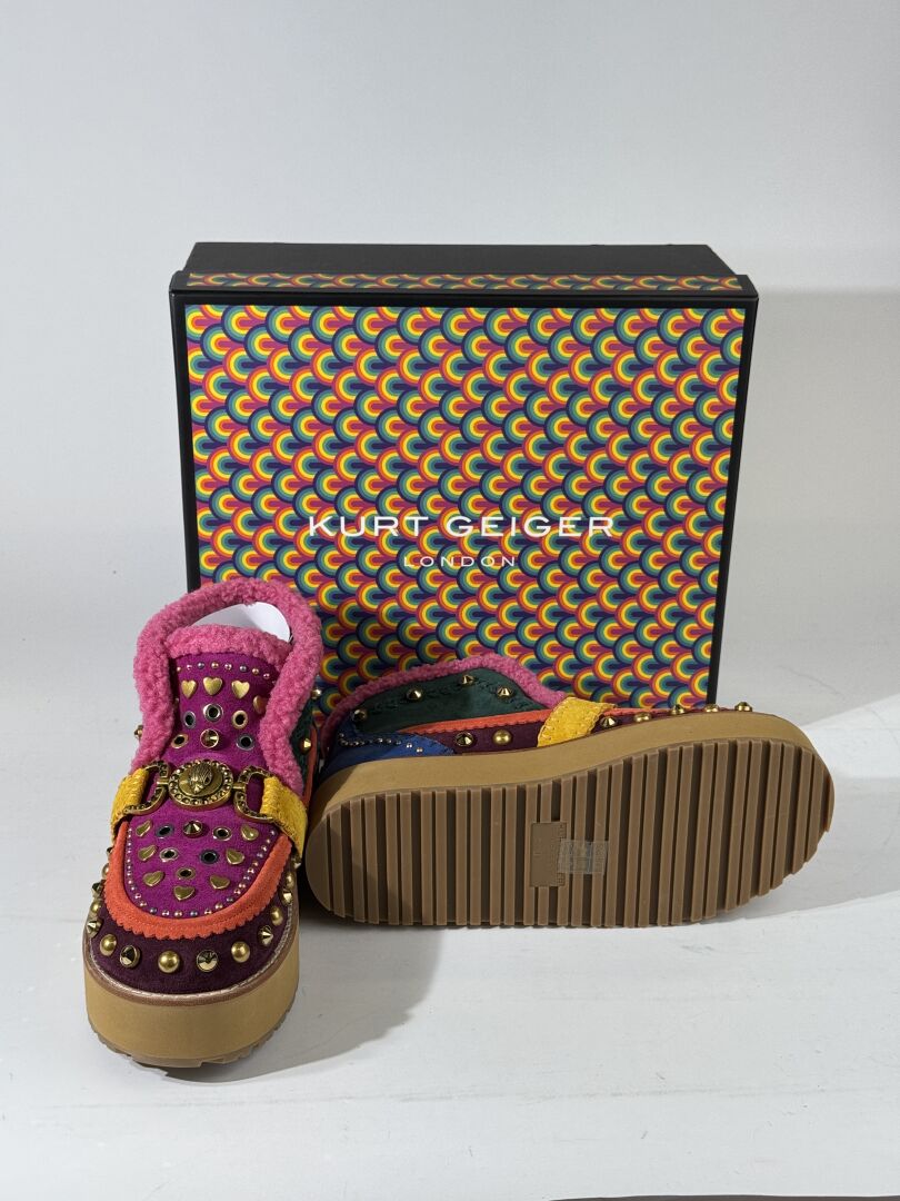 KURT GEIGER - Paire de souliers en daim multicolore rehaussé de clous et strass. Pointure 39 Etat magasin