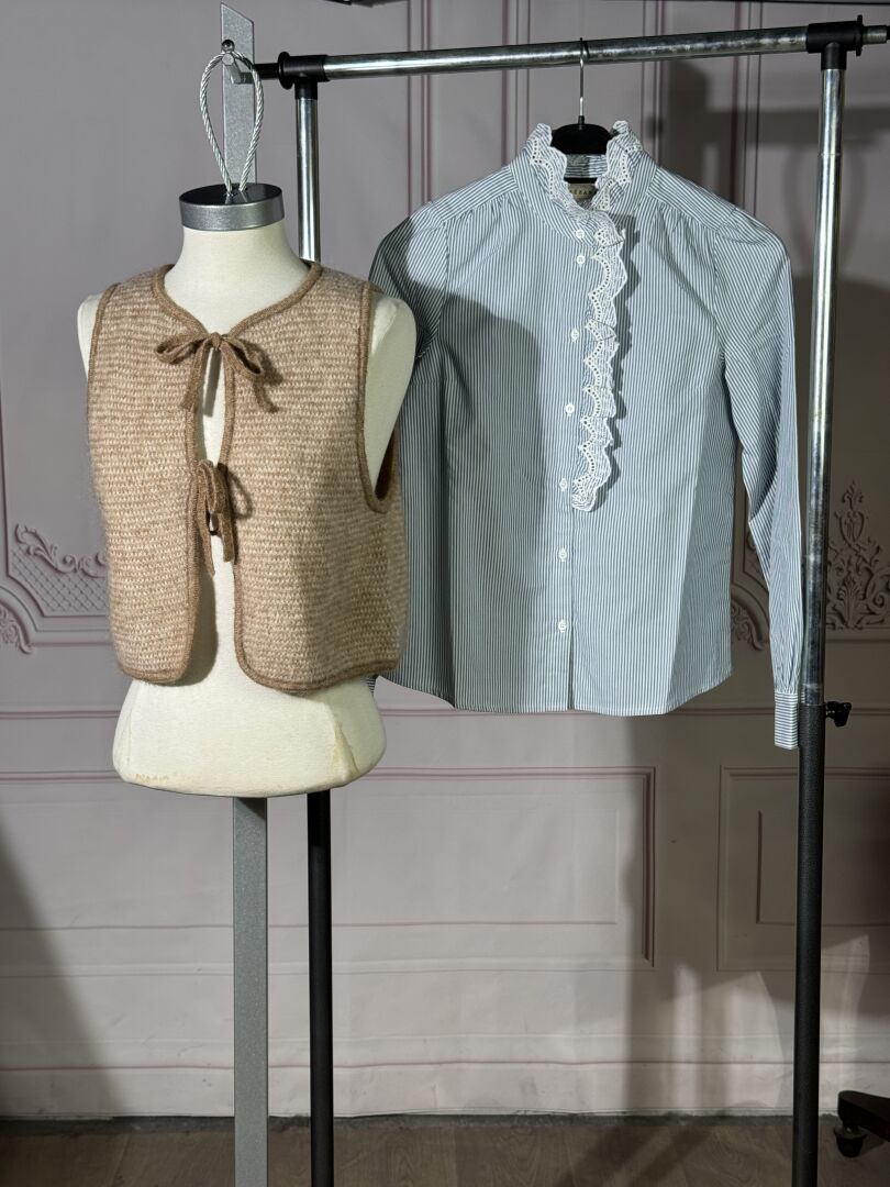 SEZANE - Ensemble comprenant un chemisier en coton rayé bleu et blanc, guipure blanche, simple boutonnage, manches longues (taille 32) et un gilet sans manche lainage chiné camel, deux liens (taille XS). Etat magasin