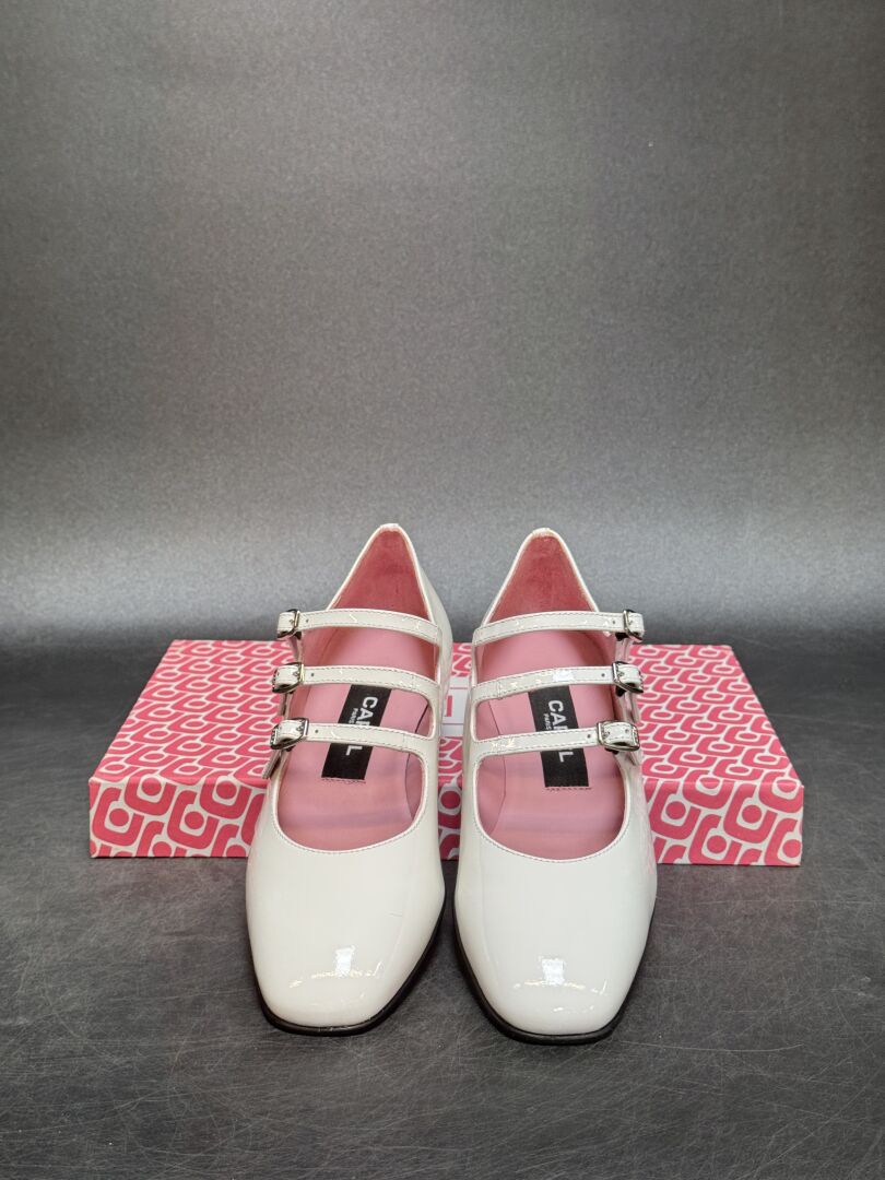 CAREL - Paire de souliers, modèle "Ariana", cuir agneau blanc vernis, trois brides, petits talons. Pointure 39 - Haut du talon : 2,5 cm Etat neuf