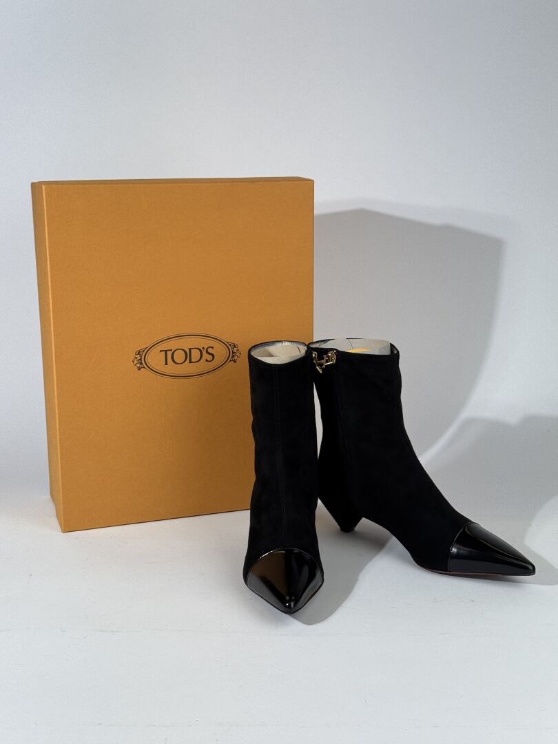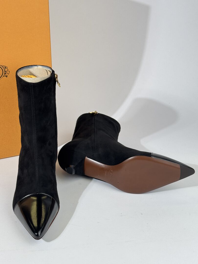 TOD'S - Paire de bottines, modèle "Néro", à petits talons, daim noir, bout pointu en cuir verni noir, fermeture à glissière latérale. Boite. Pointure 36 Etat magasin