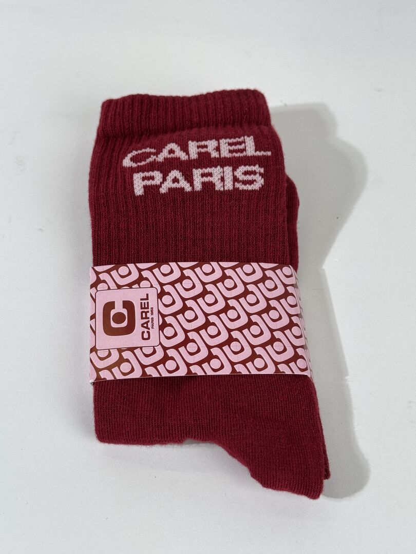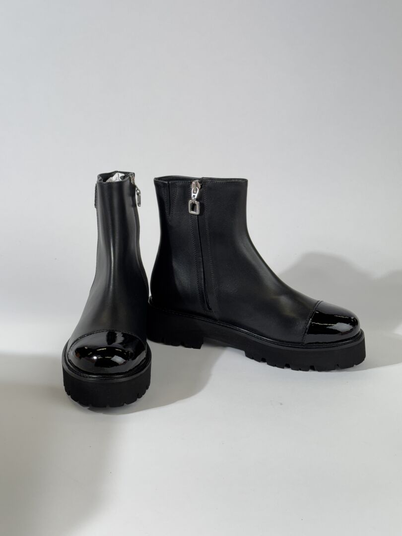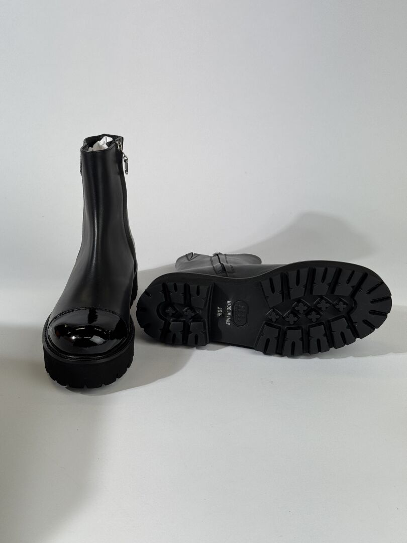 CAREL - Paire de bottines modèle "Chouchou", cuir noir et bout vernis noir, semelles crantées, fermeture à glissière latérale. Boite. Pointure 36,5 On joint une paire de chaussettes. Etat magasin