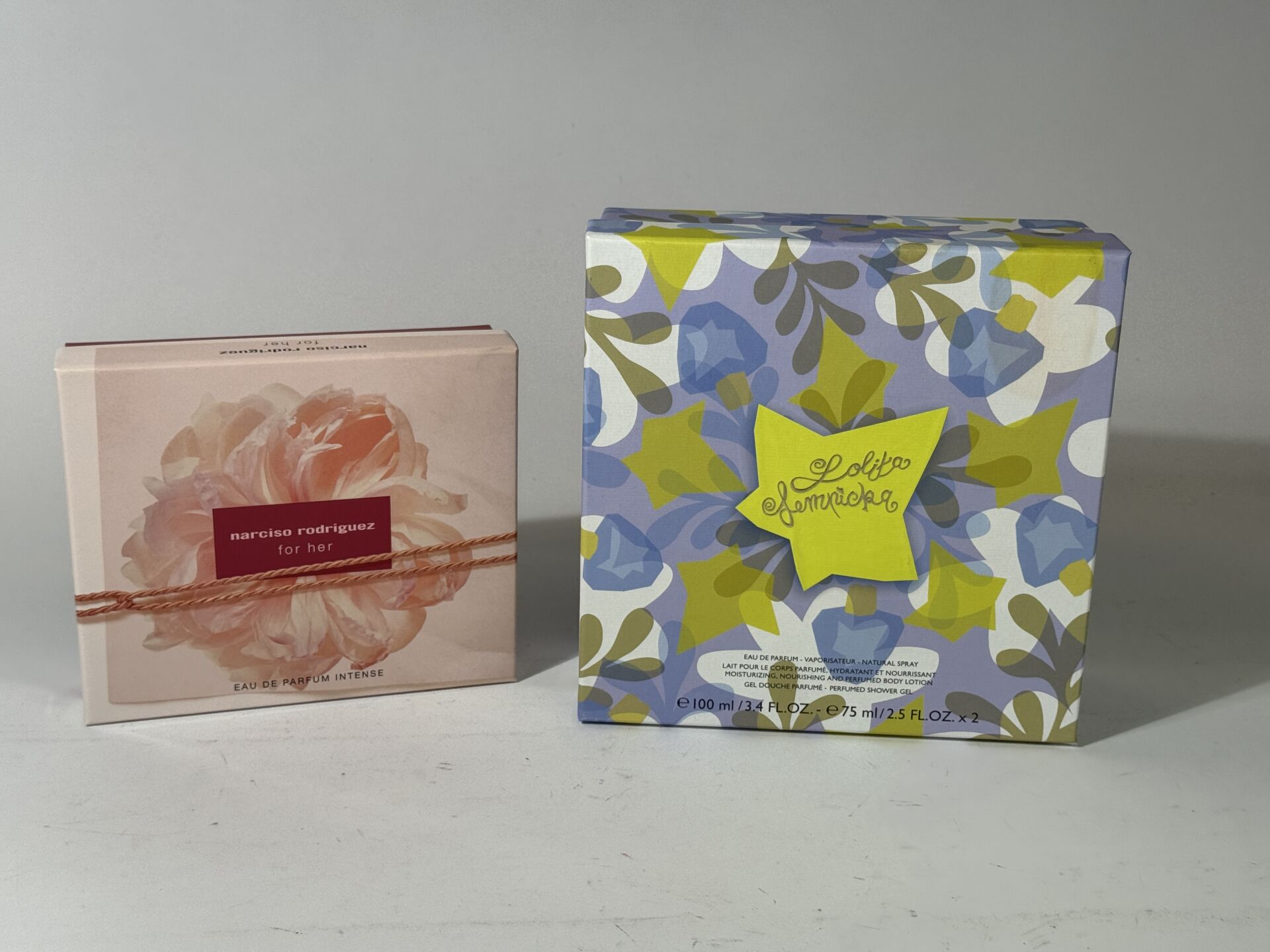 Lot comprenant deux coffrets : - NARCISO RODRIGUEZ - "For Her", eau de parfum intense 50 ml et un lait pour le corps 50 ml ; - LOLITA LEMPICKA - "Lolita Lempicka", eau de parfum 100 ml, lait pour le corps parfumé 75 ml et ungel douche parfumé 75 ml.