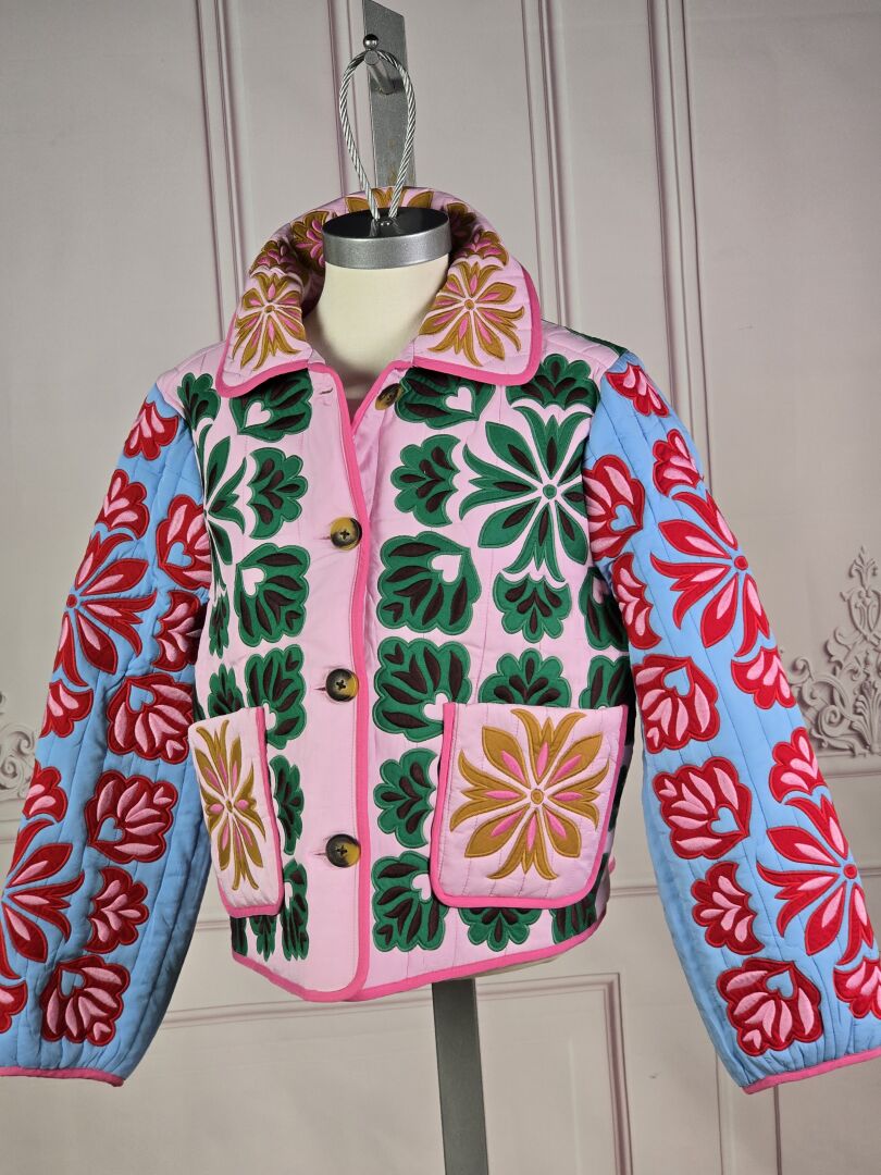 BODEN - Veste en viscose, fond rose rebrodé de fleurs multicolores, petit col, simple boutonnage, deux poches. Taille 14 UK (soit 40 français) Etat magasin