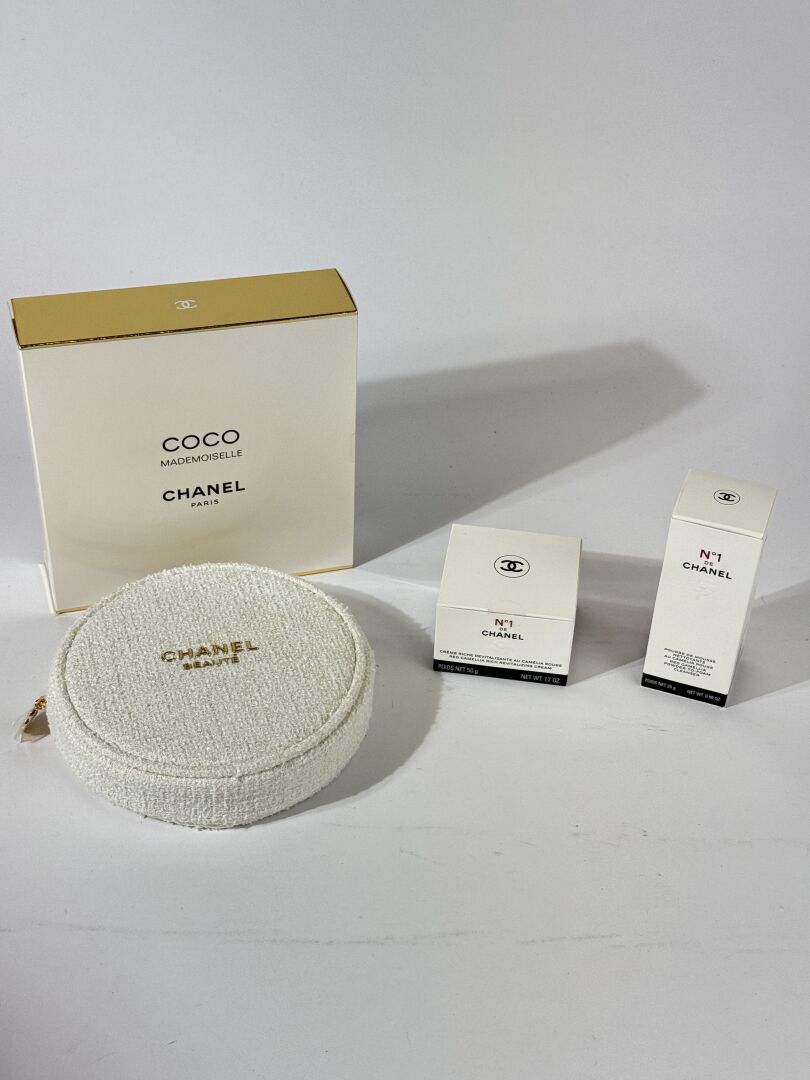 CHANEL - Coffret trousse ronde comprenant une eau de parfum "Coco Mlle" en 50 ml et un rouge coco baume (918 : MY ROSE satiné), une crème Riche revitalisante N°1 (50 gr) et une poudre de mousse nettoyante N°1 (25 g)