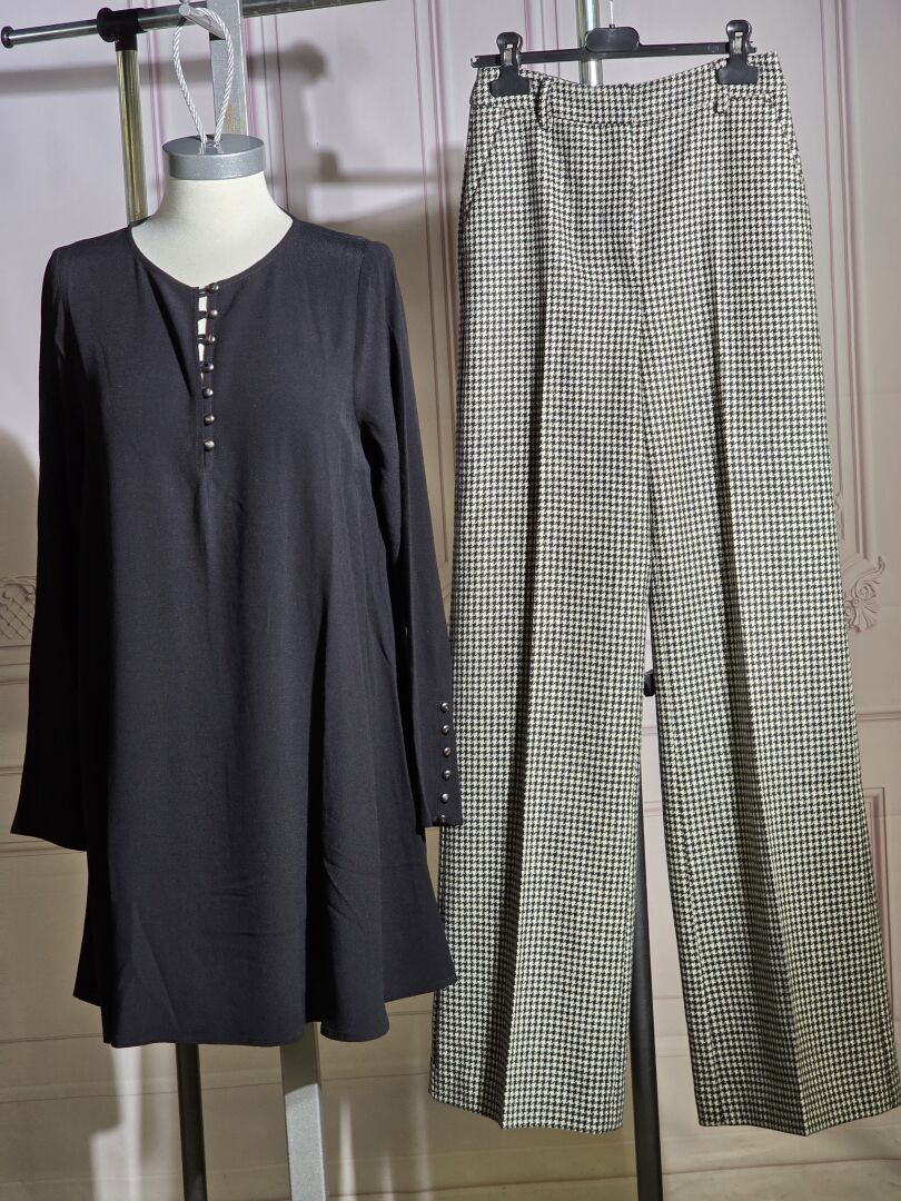 SEZANE - Lot comprenant un pantalon en lainage pied de poule noir et blanc et une robe évasée en viscose noir, manches longues. Taille 34 Etat magasin