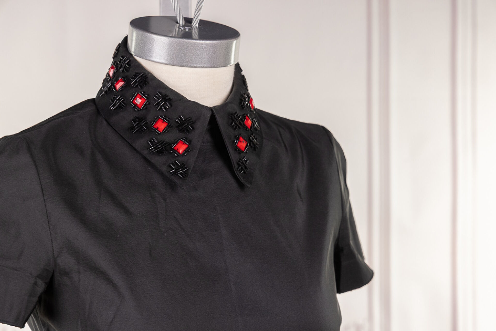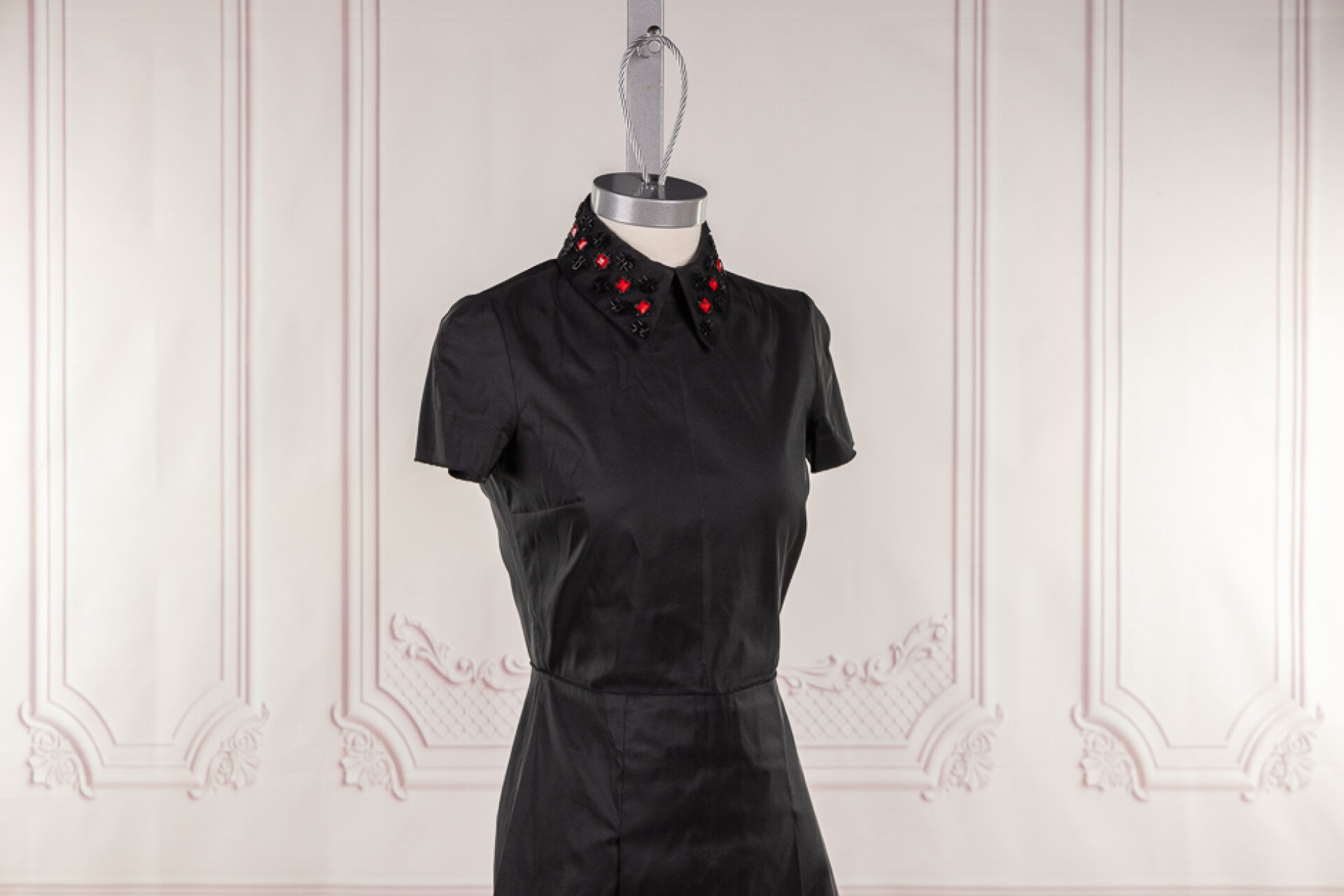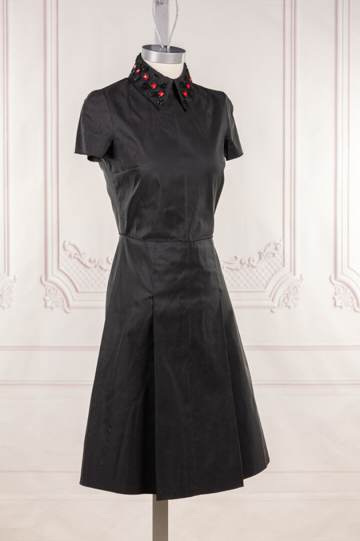 JIL SANDER NAVY - Robe courte en faille de soie et polyester noir à col rebrodé de perles noires tubulaires et plaques facettées rouge, petites manches à bords francs, effet de panneaux sur la jupe devant et dos en plis creux. Taille indiquée 34 Quelques manques et usures