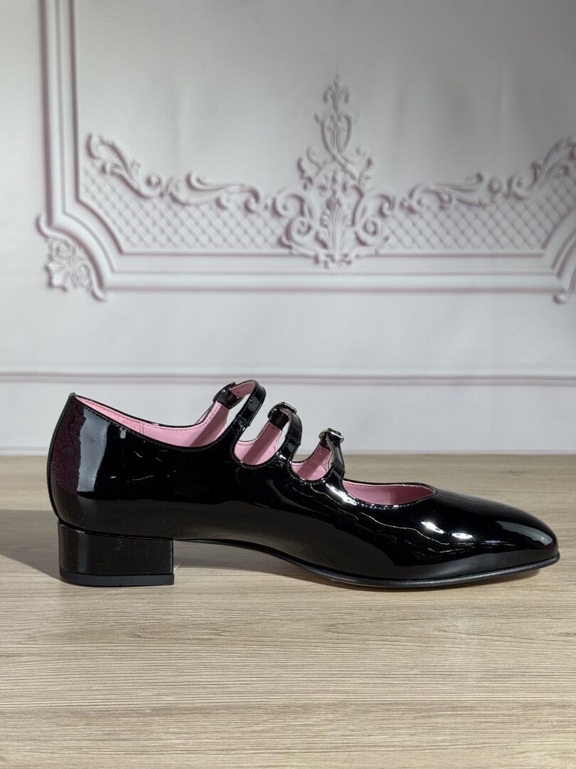 CAREL - Paire de souliers, modèle "Ariana", cuir agneau noir vernis, trois brides, petits talons. Pointure 39.5 - Haut du talon : 2,5 cm Etat neuf