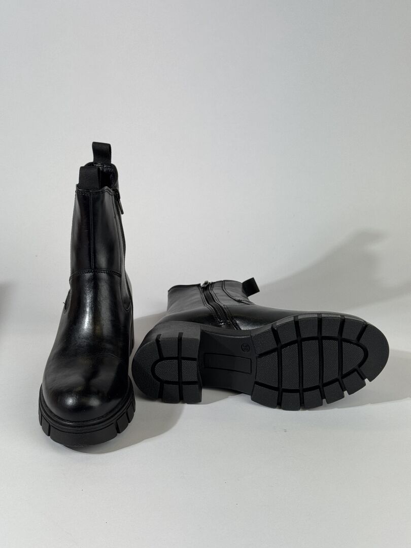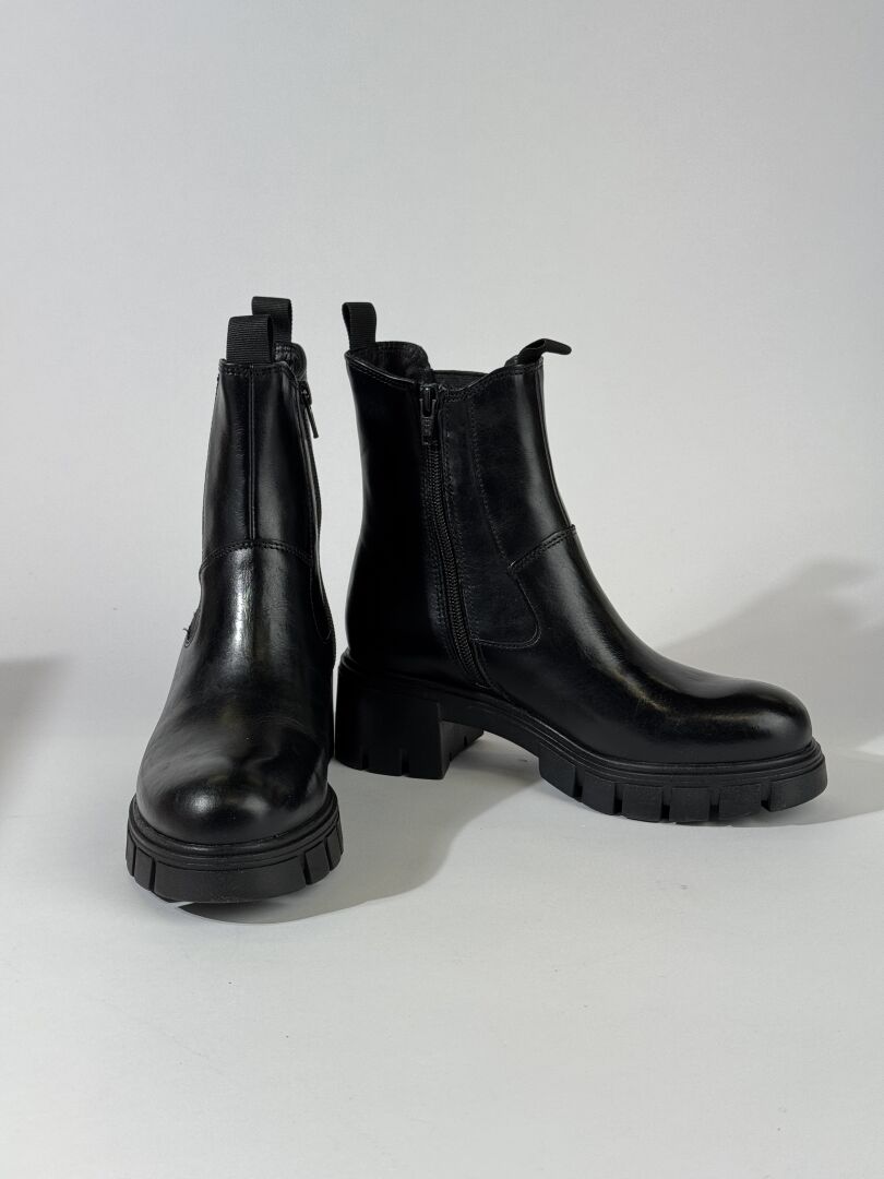 JONAK - Paire de bottines, cuir noir, fermeture à glissière latérale, semelles crantées, petits talons. Boite. Pointure 36 - Haut. Du talon : 5,5 cm Etat magasin