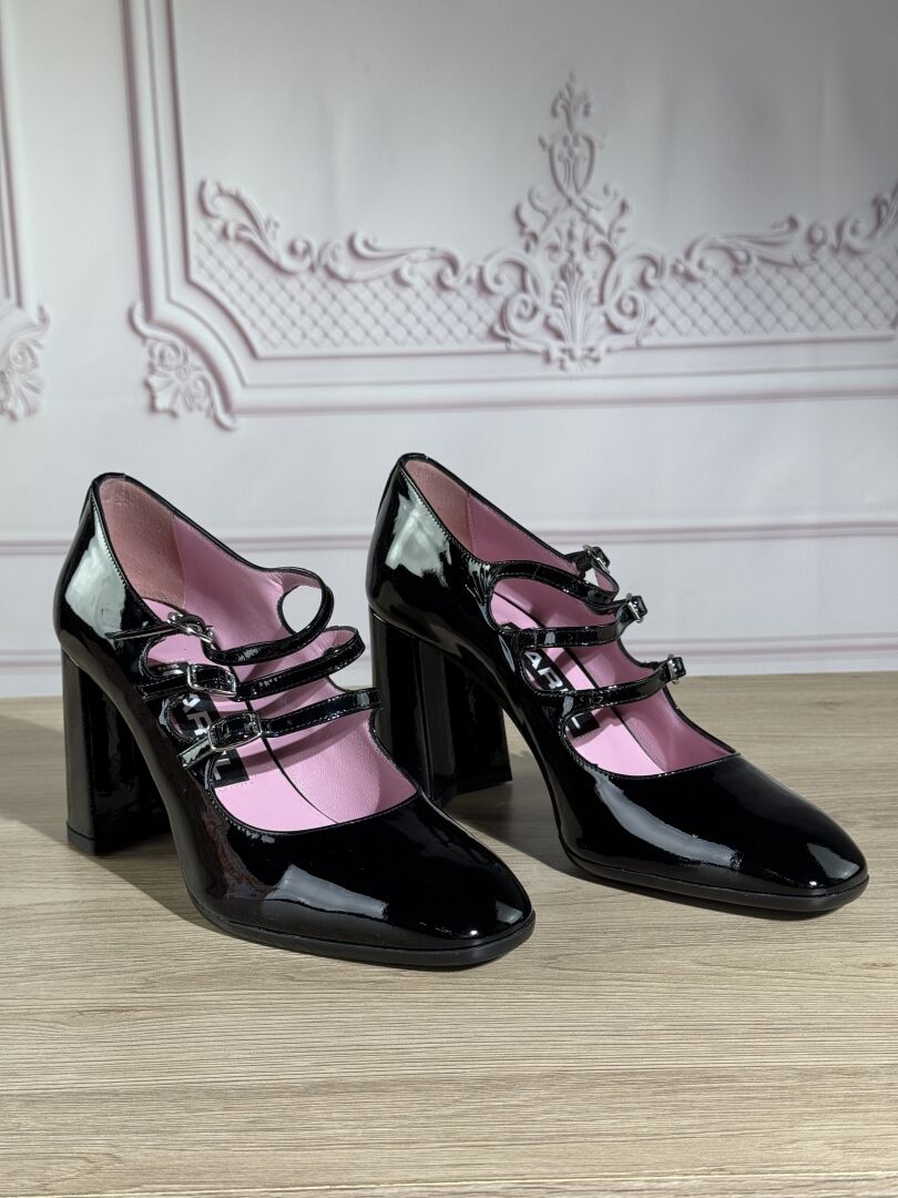 CAREL - Paire de souliers à talon, modèle "Keel", cuir agneau noir vernis, trois brides. Pointure 39 - Haut du talon : 8,5 cm Etat neuf