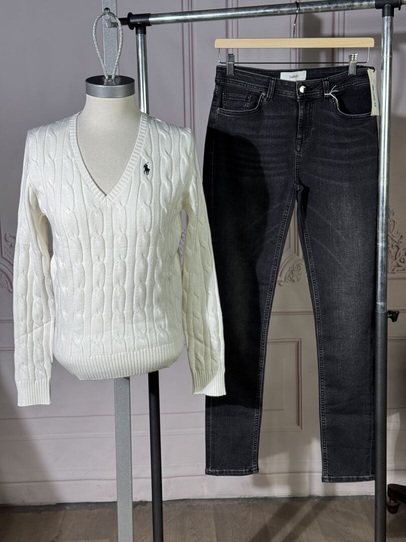 BA&SH - POLO RALPH LAUREN - Lot comprenant un jean denim noir (taille indiquée 28) et un pull en mailles fantaisie écru, encolure en V et manches longues (taille supposée 36-38). Etat magasin