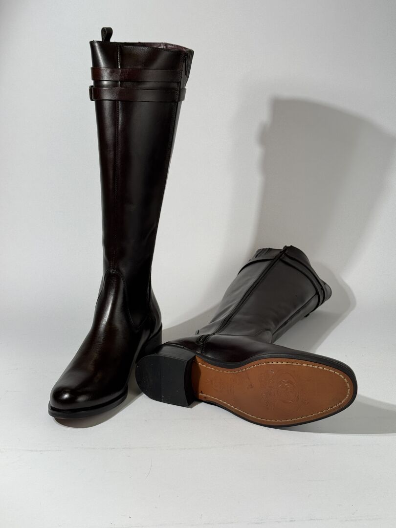 GIROTTI - Paire de bottes en cuir marron foncé, fermeture à glissière latérale, petit talon. Boite. Pointure 41 - Haut du talon : 4 cm Etat magasin