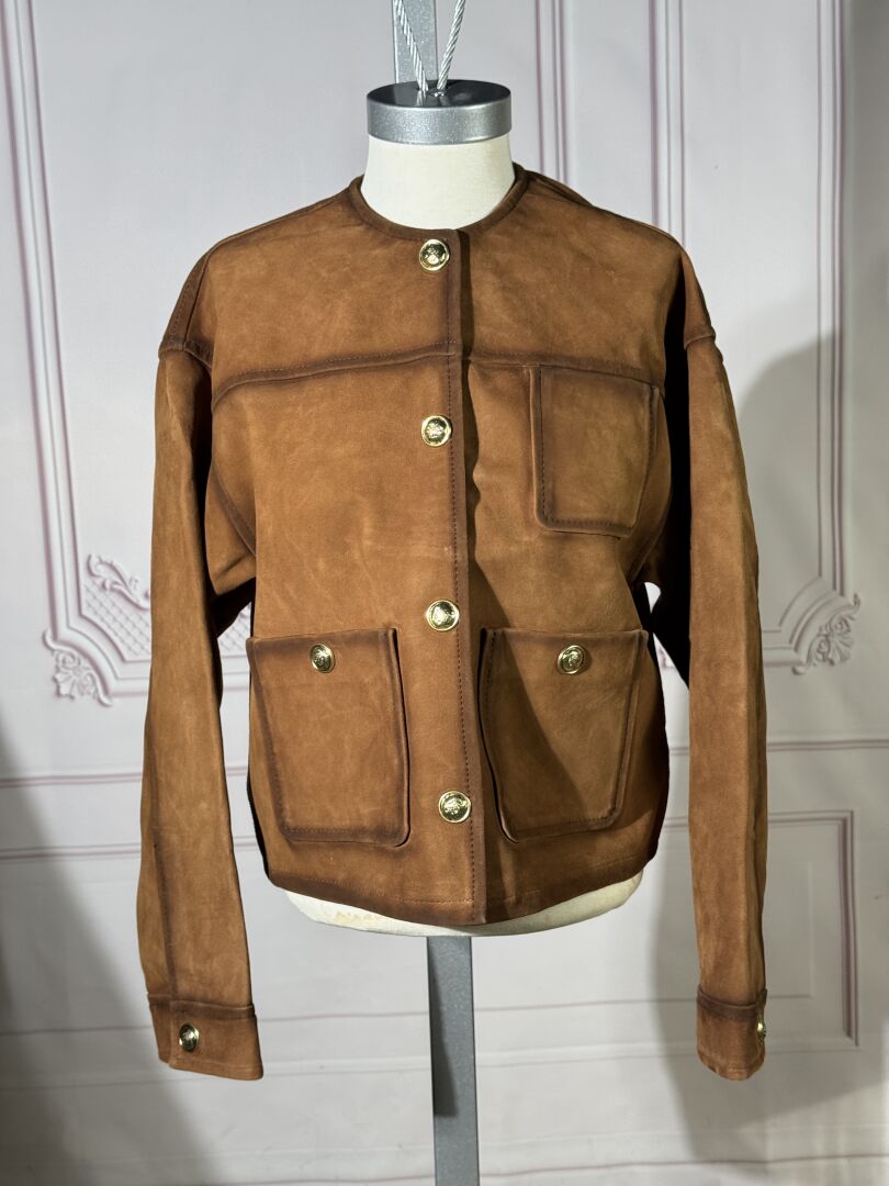 SANDRO - Veste courte en daim camel, simple boutonange pression, trois poches plaquées dont deux à bouton, manques longues. Taille 24 Etat magasin