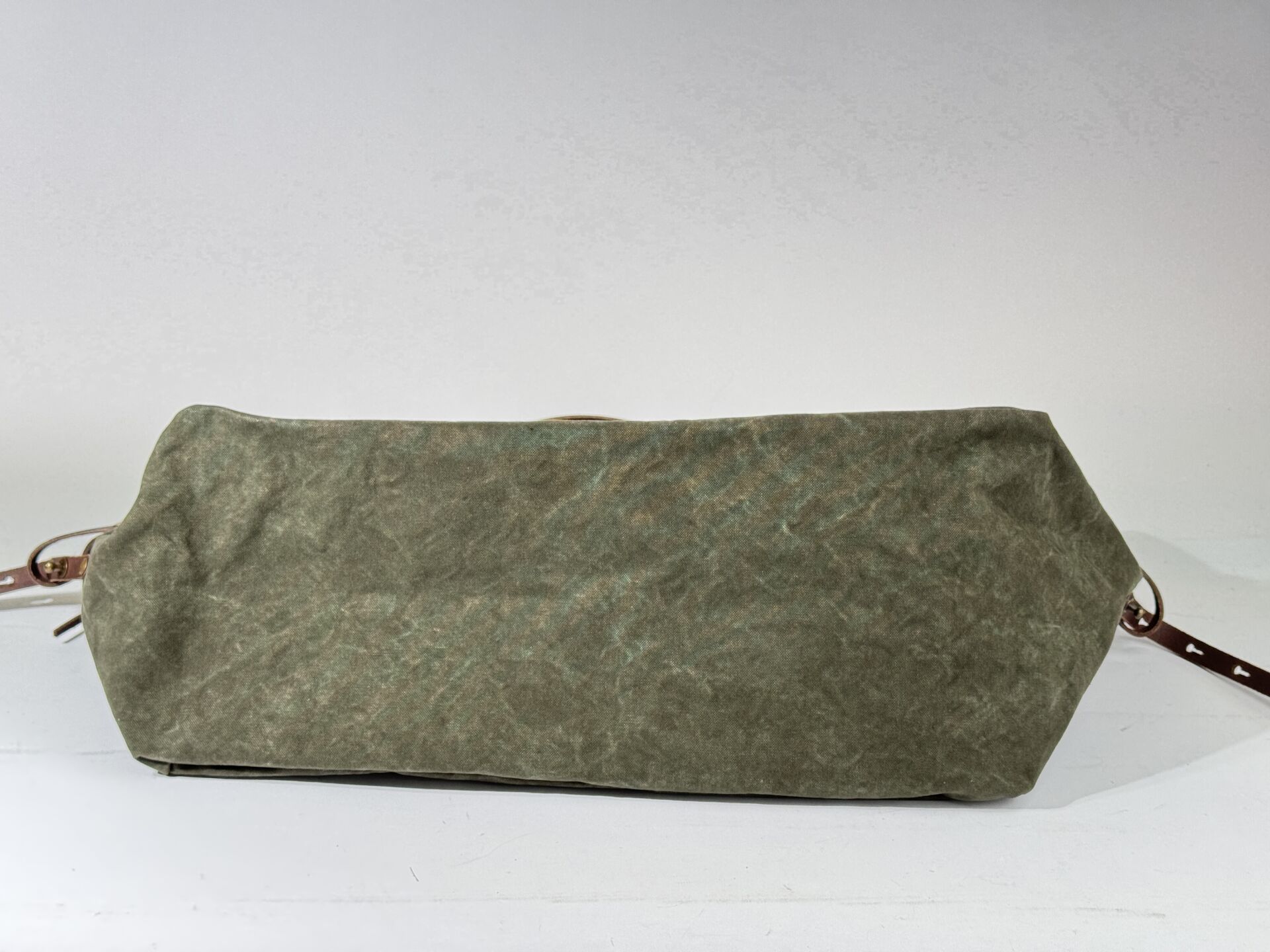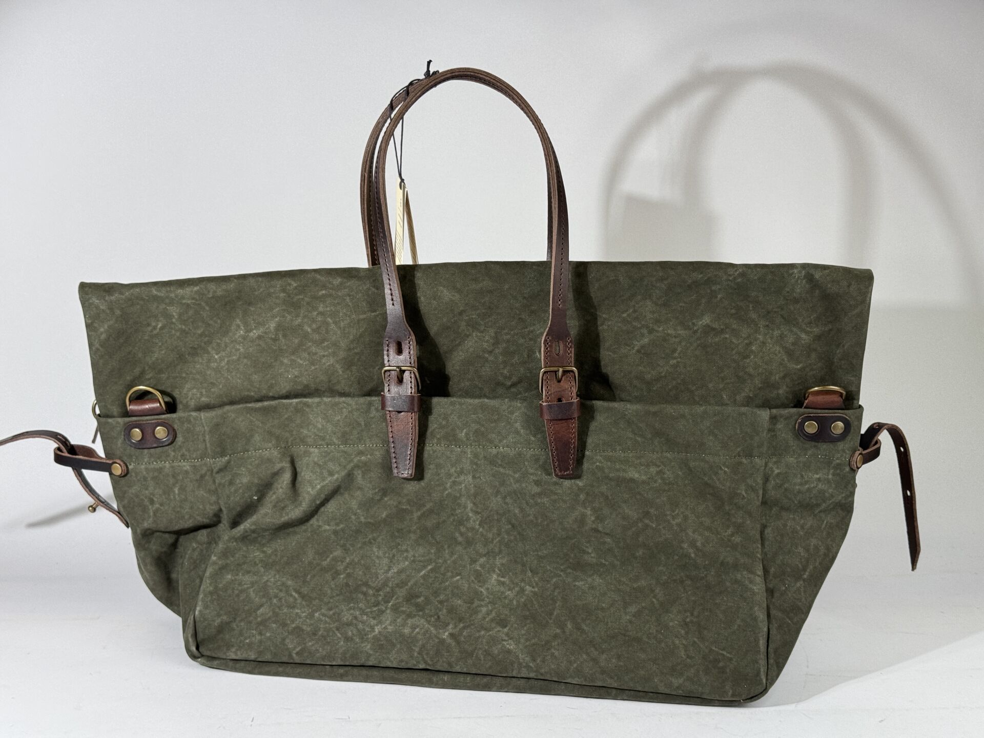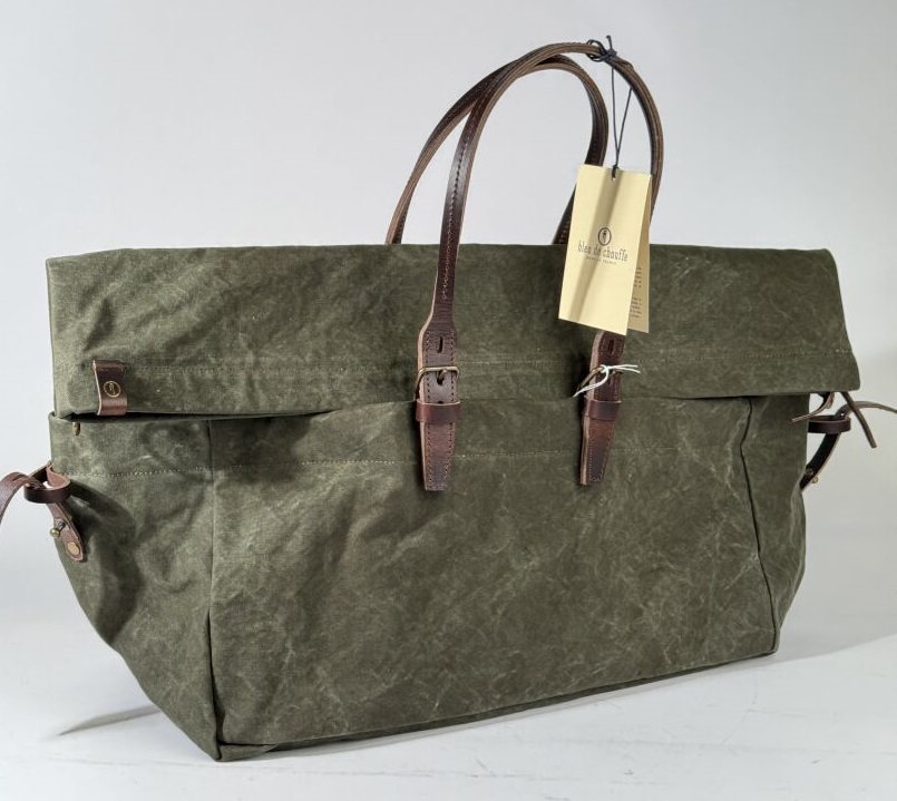 BLEU DE CHAUFFE - Sac de voyage homme, toile wax kaki, double poignées cuir marron, fermeture à glissière, anse bandoulière. Haut. : 36 cm - Long. : 50 cm Jamais porté, très bon état, petites traces