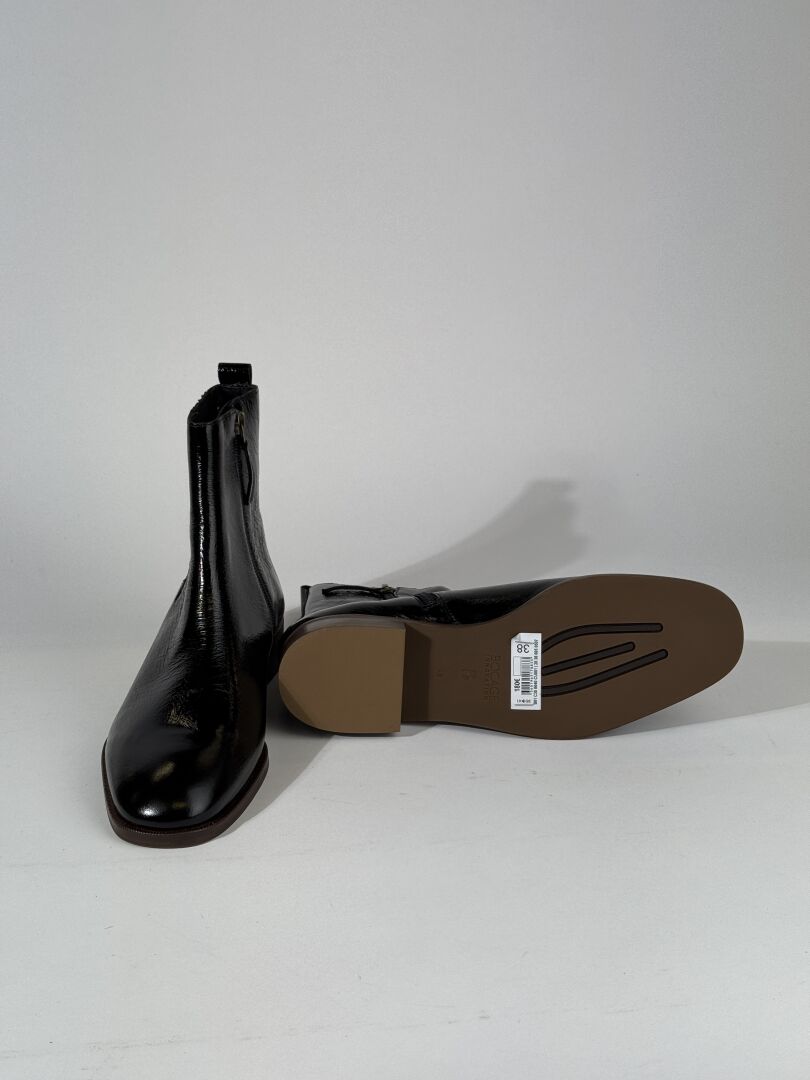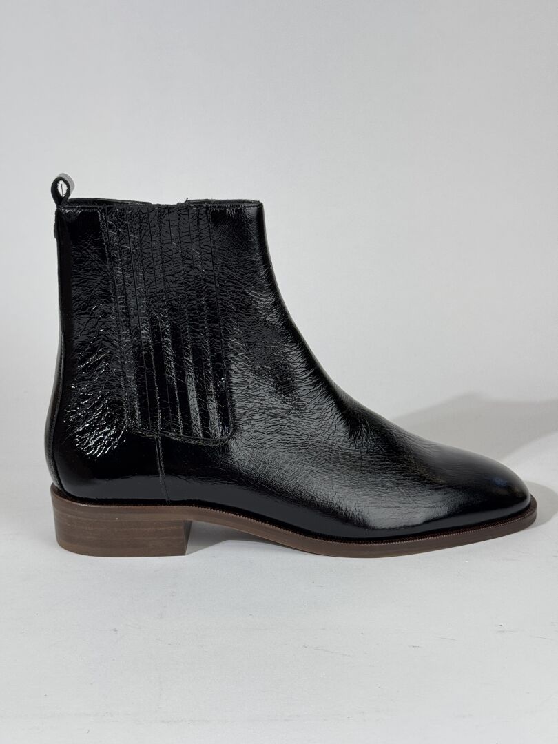 BOCAGE - Paire de bottines modèle "Miranda", cuir vernis noir, fermeture à glissière latérale, petit talon. Boite. Pointure 38 - Haut. Du talon : 2,5 cm